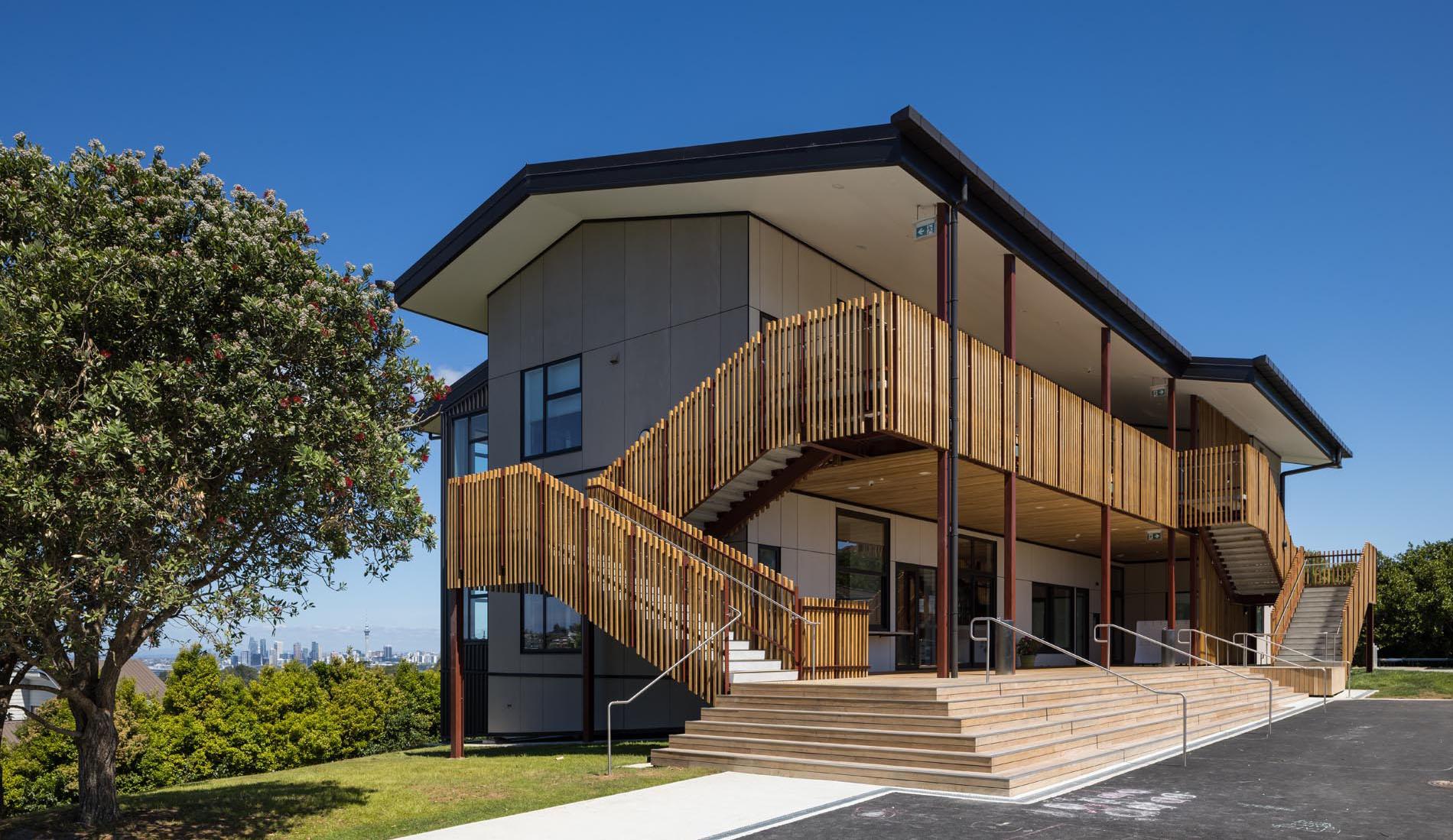 The eastern facade offers sweeping views of the Northshore and Harbour, stretching toward the city skyline. Strategically placed windows cater for both students and adults, allowing natural light to flood the spaces while framing the breathtaking scenery. On the western side, sliding windows and doors open onto covered deck areas, enhancing outdoor learning opportunities and fostering connectivity across the wider site. The lower deck steps double as casual seating for students during breaks, adding functionality to the design.