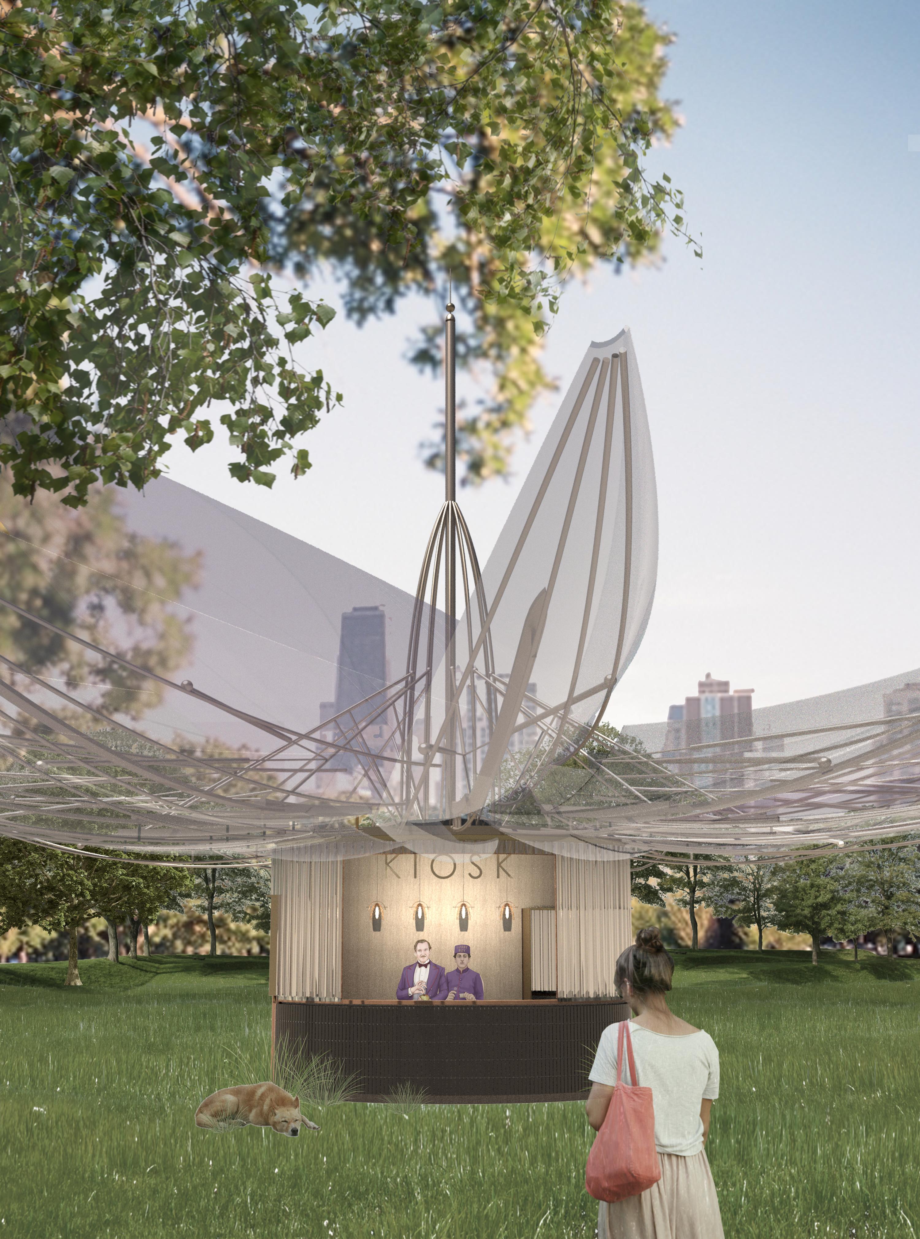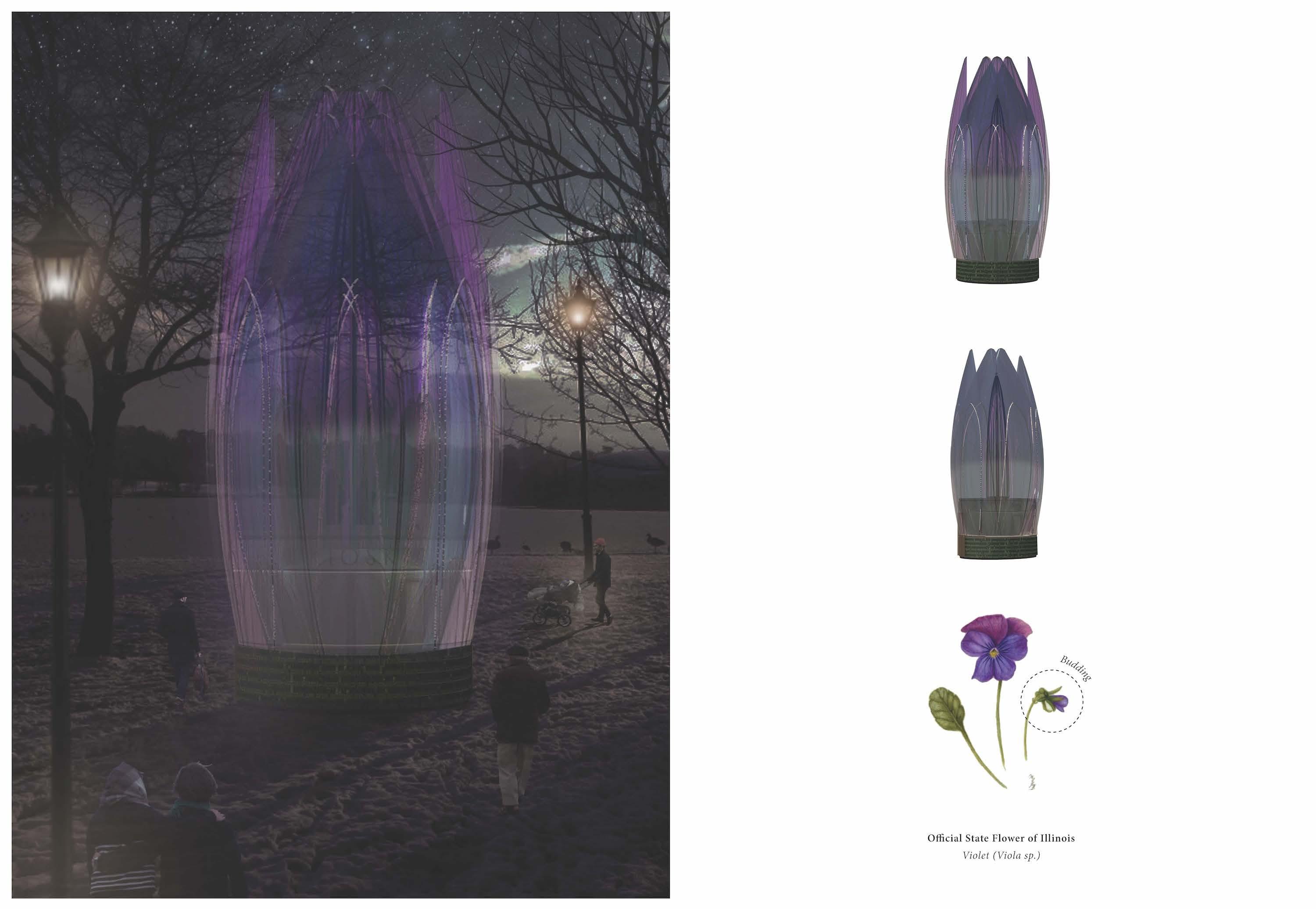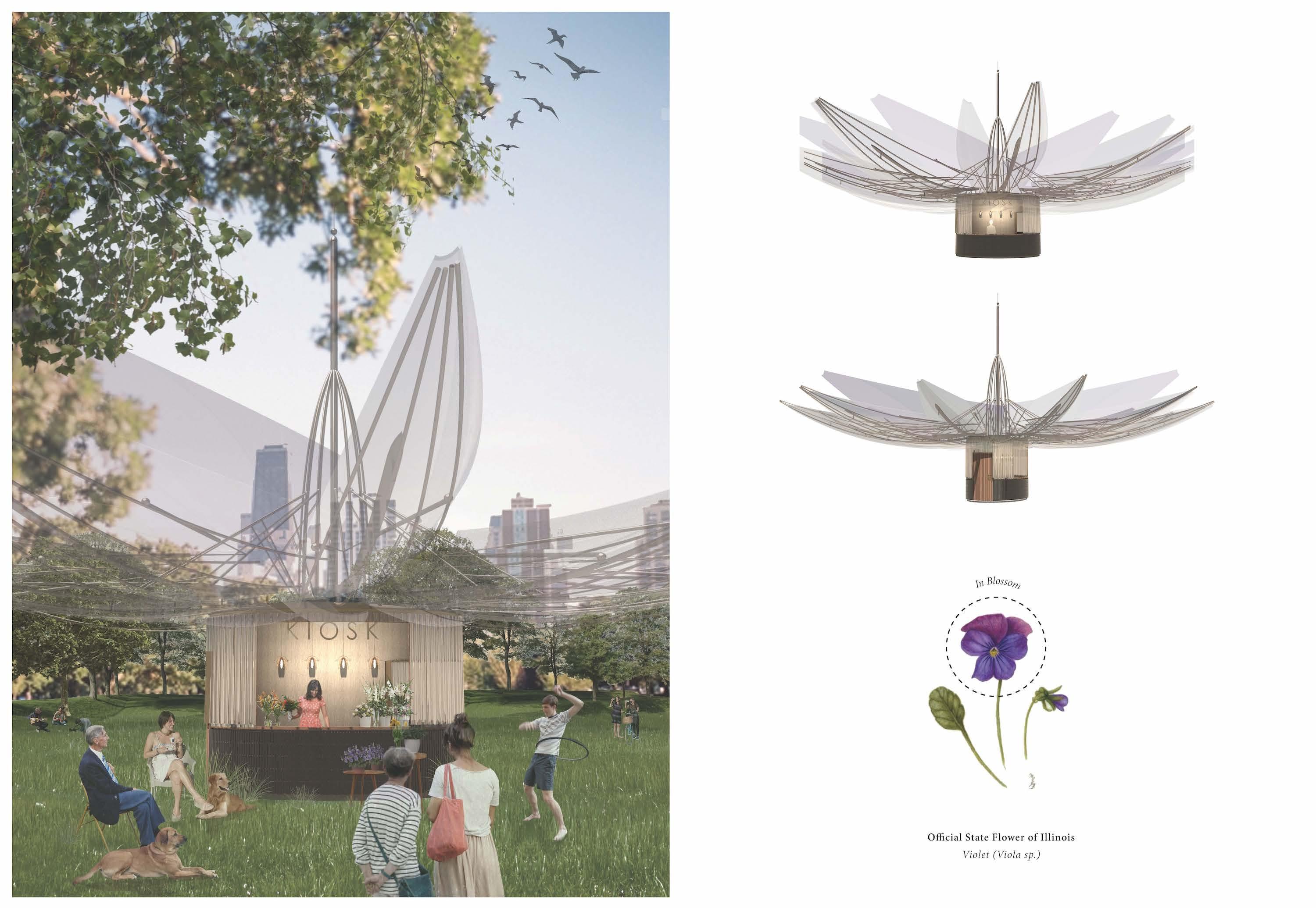 The objective of the design is to enhance the Chicago Lakefront year round by performing a function regardless of the season. The kiosk will open and close with a dramatic folding action of the petals mounted on the roof of the kiosk. The petals are dervied in form and colour of the violet, the State of Illinois flower. Throughout the hot summer, the unfolded kiosk will provide shade for visitors to sit comfortably and enjoy whatever commercial function the kiosk might serve. In winter, the kiosk will be folded closed to create a tall, sculptural form.