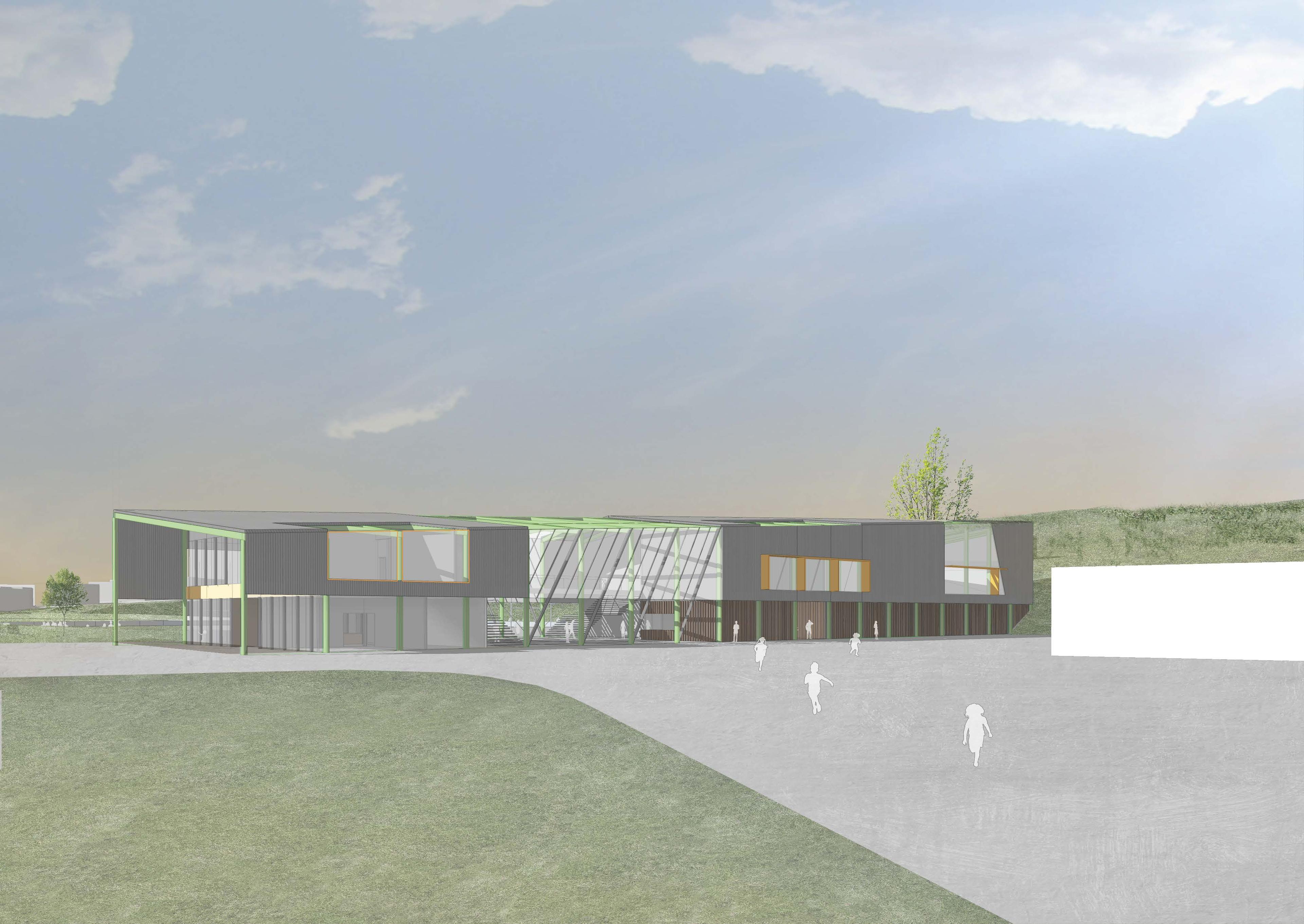 The roof form and upper walls are clad in profiled metal roofing. The lower walls of the sports hall clad in textured concrete wall panels. The administration, classrooms and covered courtyard are similarly treated with metal roofing and upper walls with larger areas of glass to connect to the wider views from the site and provide daylight and outlook for the occupants. These areas of glass will be controlled to minimize glare and overheating The courtyard roofing is envisage to be a translucent material to allow for the transmission of light to provide a welcoming space at all times of the year.