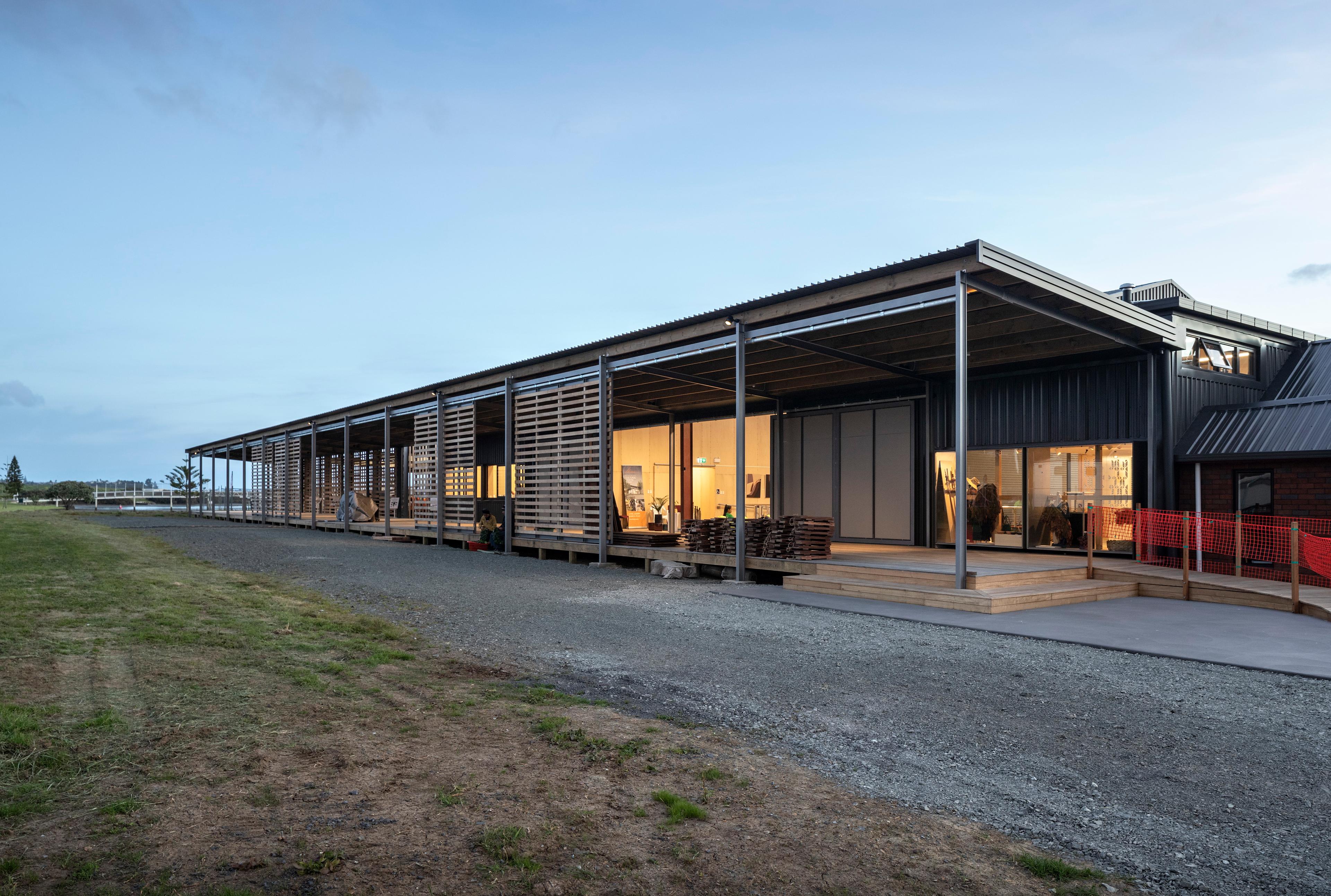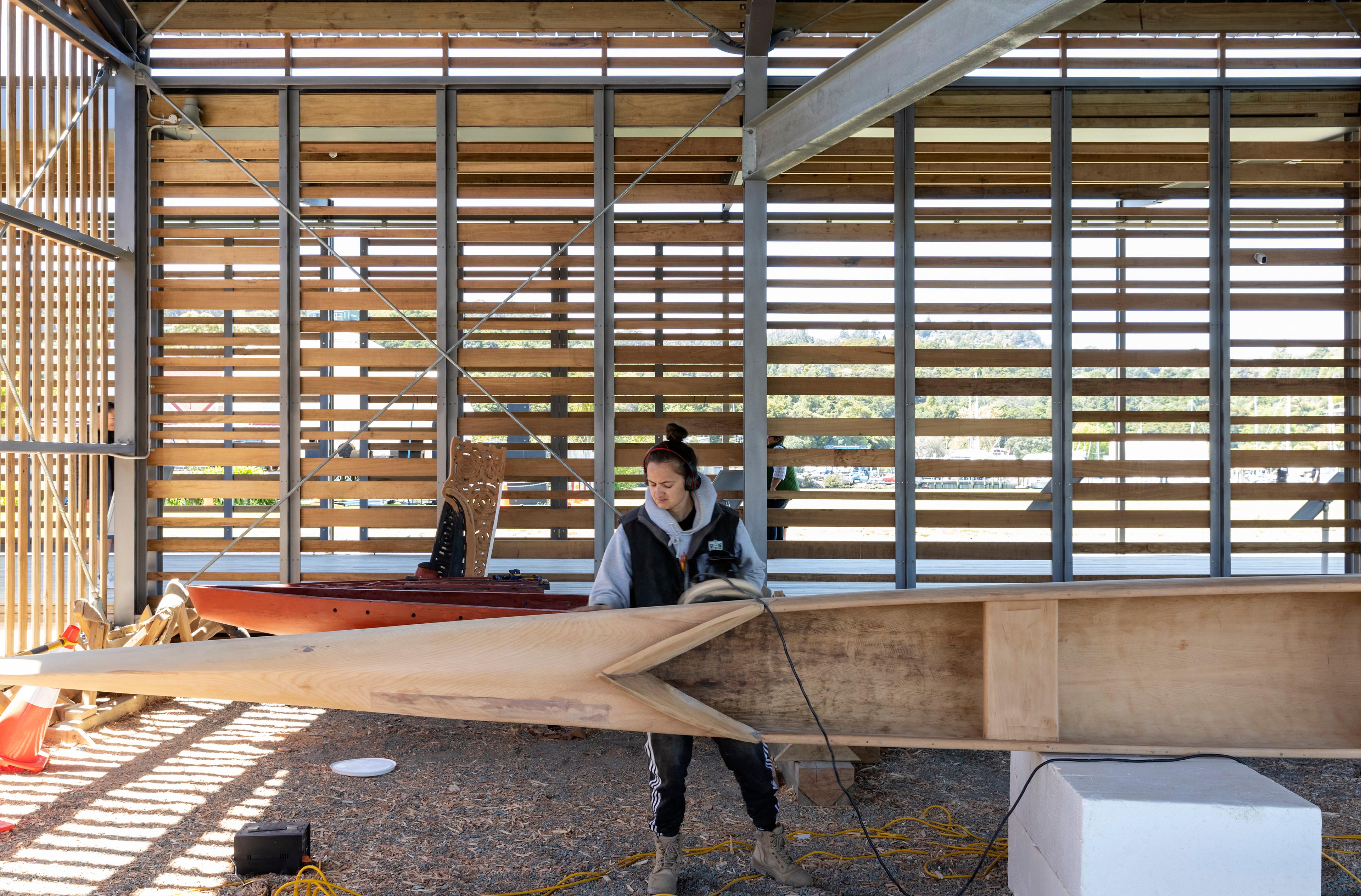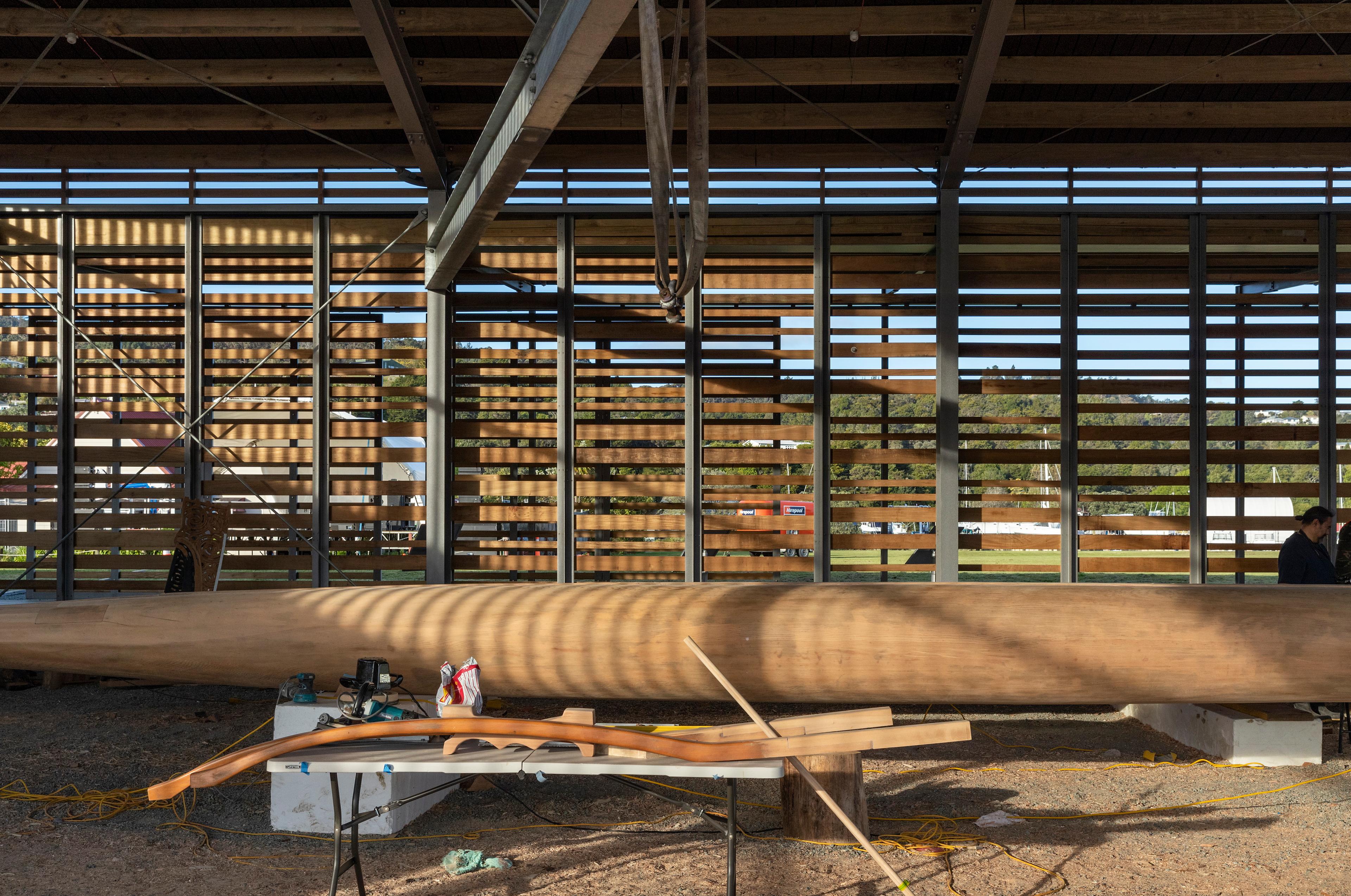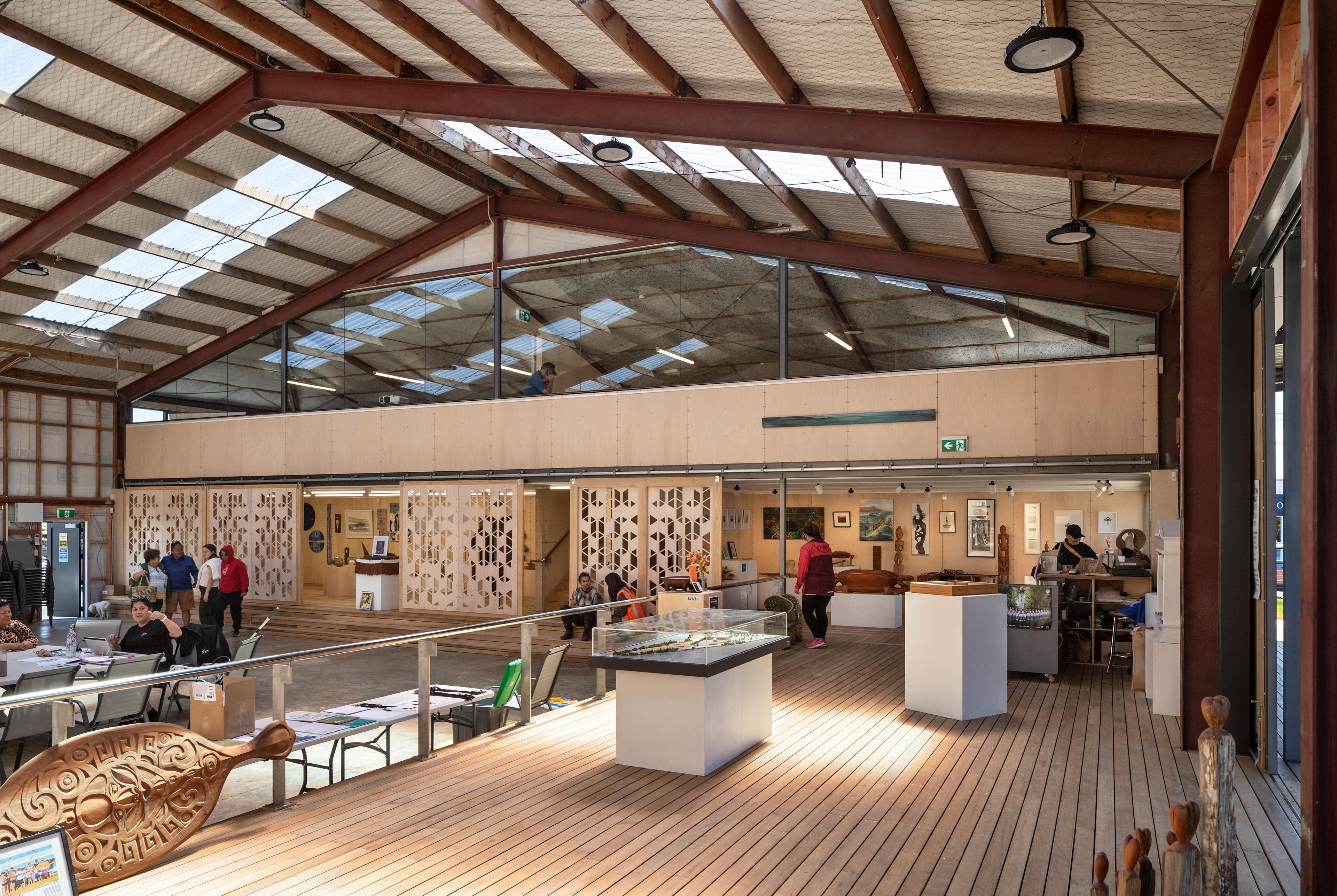 The first phase incorporates the existing boatshed on the site and transforms it into the Whare Toi to house a range of activities in furthering the traditions and craft of the Māori carving and weaving amongst other activities. A new mezzanine added to include kitchen facilities and meeting space. A laboratory space is on the ground floor. A display area allows for the display and sale of smaller items produced by the workshop. A raised floor accommodates members of the public and visiting groups to see the activities without interfering with the carving and cutting areas of the workshop.