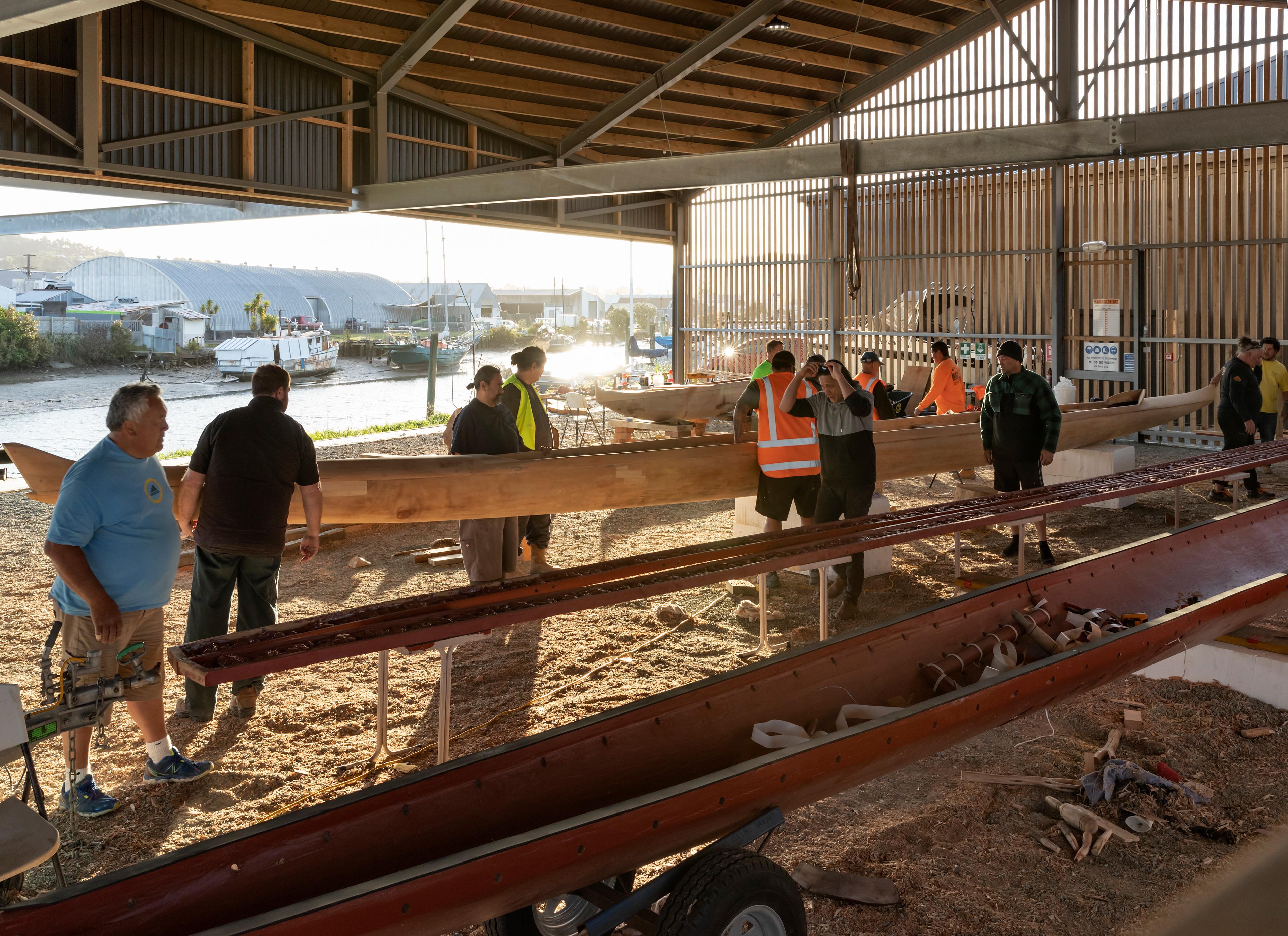The Whare Waka sits alongside the Whare Toi, a new building to house, protect and display the collection of Waka within a building that is roofed but has open sides so that waka are able to be viewed at any time through slatted timber screens. The Whare Waka incorporates a gantry to facilitate the launching of waka directly into the adjacent river.