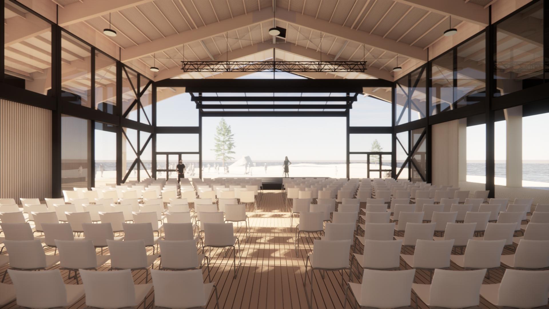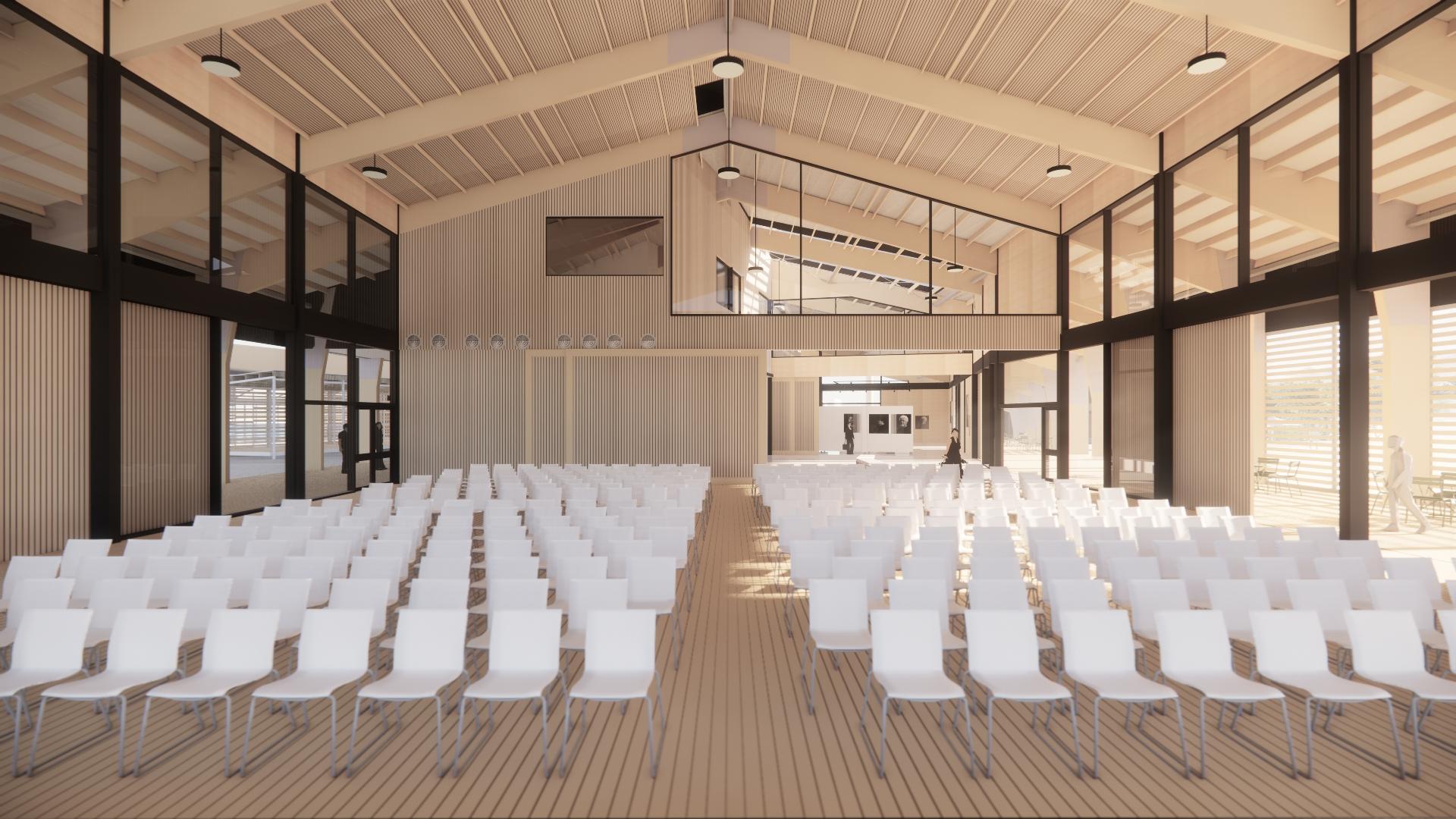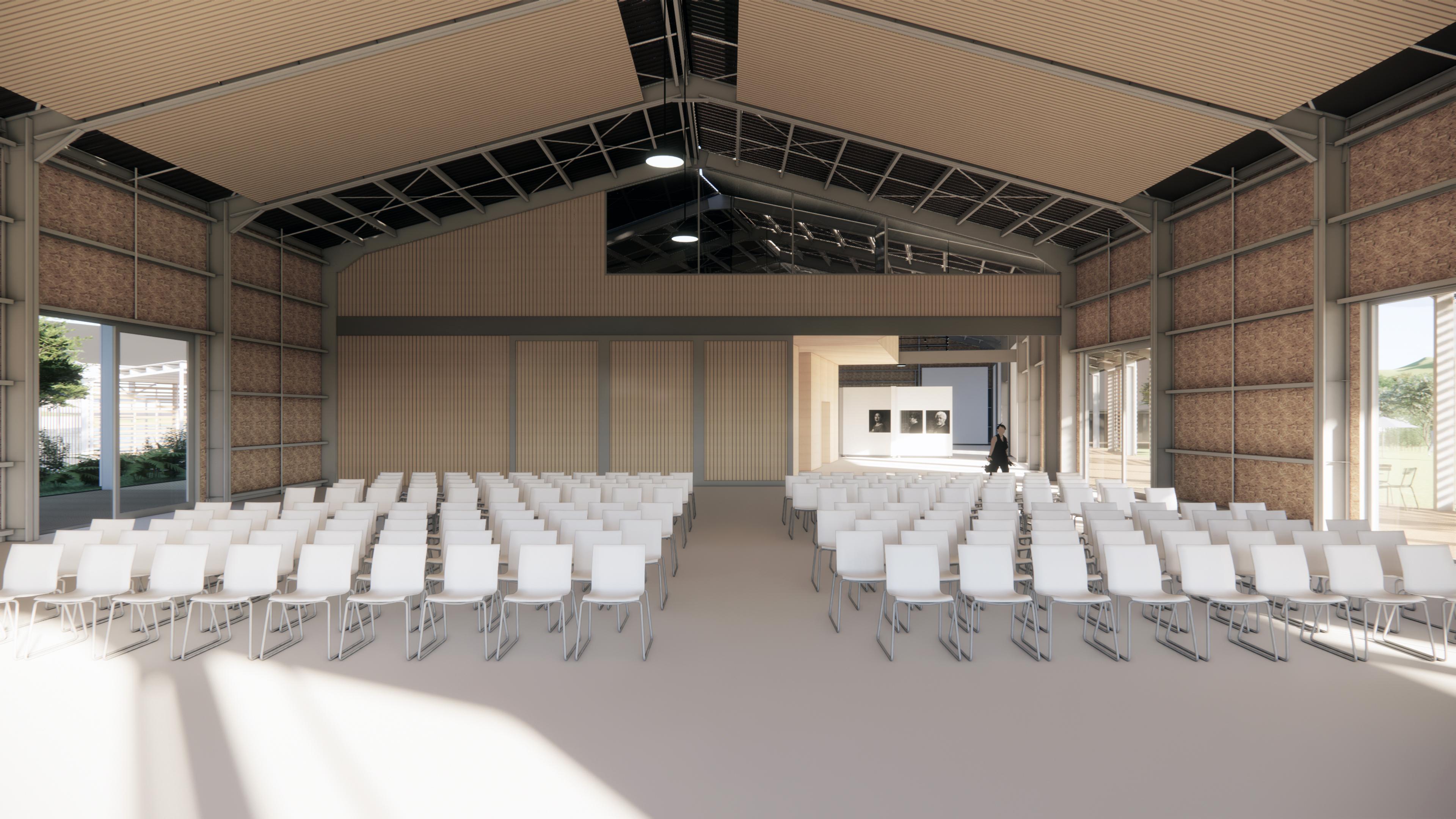 It is first and foremost a Tuia te Muka Tangata, a place where people can come together proceeding from the arrival to the site at Herekino Street. It is from this place that other areas of the Hihiaua Cultural Centre and site are accessed and explored. Tuia te Muka Tangata performs many functions from arrival, greeting, Powhiri display of art and craft and as a performance space. The performance space can be configured to house a stage and audience within Tuia te Muka Tangata or act as a place for a stage with the audience located outside on the bermed landscaping to the east. A series of back drops and curtains are proposed to be deployed hanging from the roof structure to act as a backdrop as and when required. The stage is mobile and able to be deployed in several configurations.