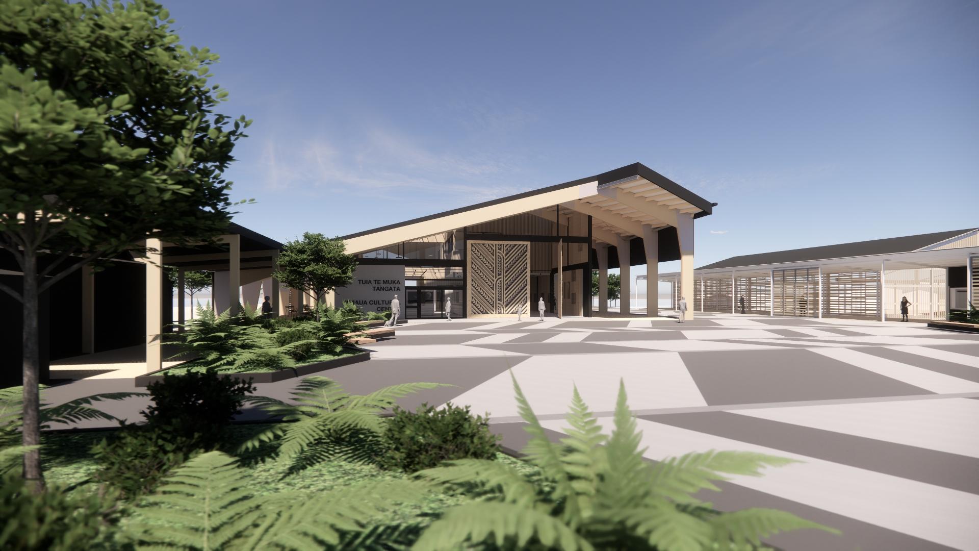 The forecourt is extensively landscaped to act as an Atea space for the gathering of a large number of people prior to entering Tuia te Muka Tangata, to facilitate the drop off of people from cars, taxis, and buses.