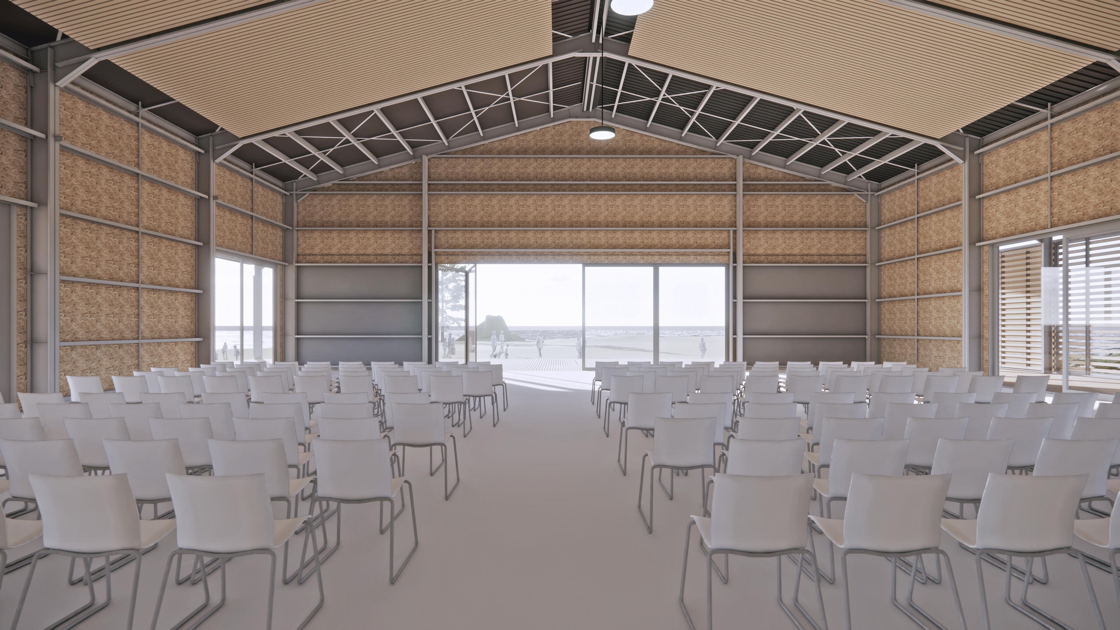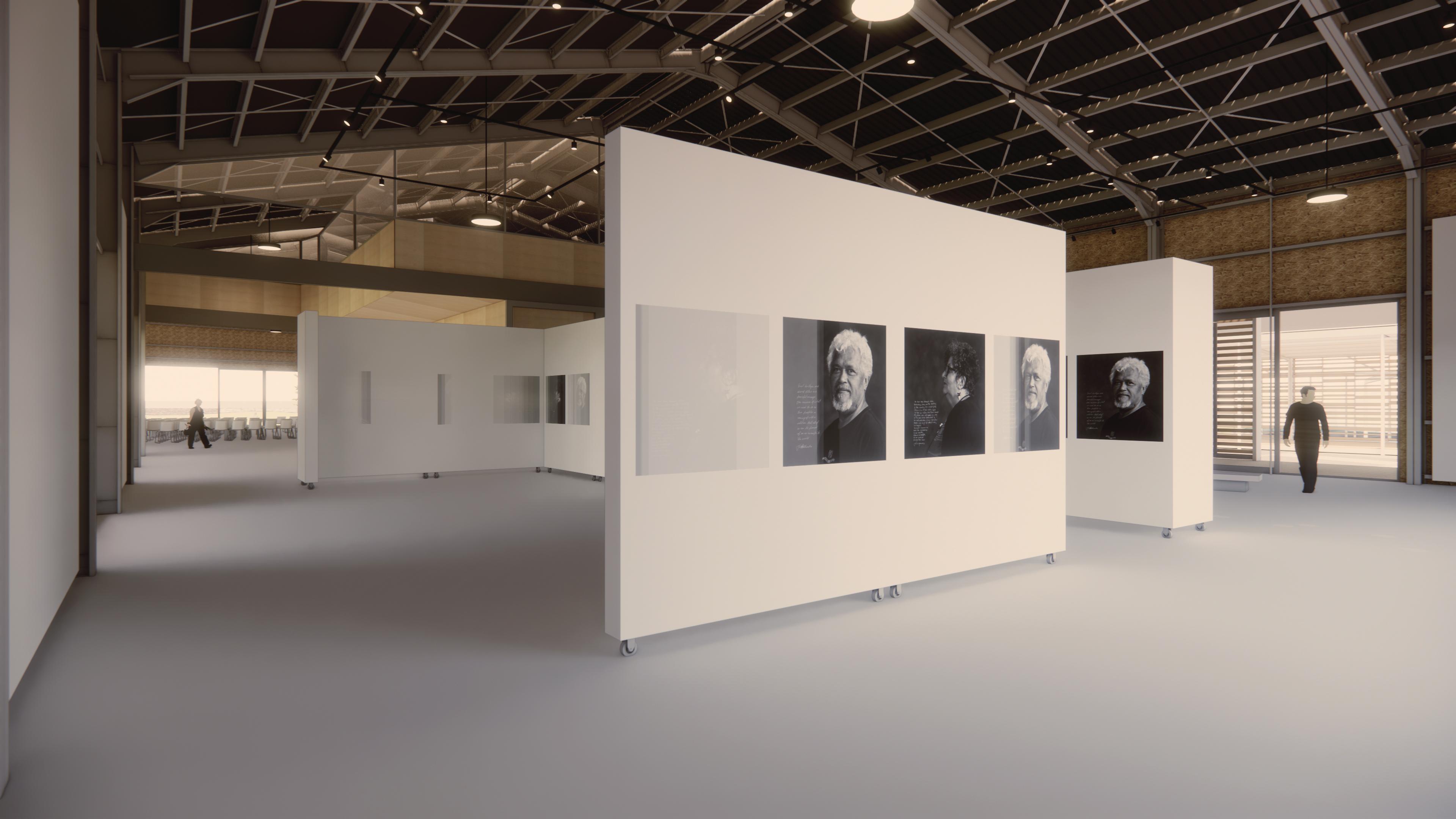 The form of the building is configured as asimple portal frame to provide a unifying roof form over the Display Space and Performance Space, recognising the geometry of the site together with the key axis of the Arrival, Mt Parihaka and the Wave and Waka Sculpture. This creates a roof form that celebrates the coming together of all under the one roof and allows the spaces to open out to the wider site context in all its facets. The large gabled roof form alludes to and references the key idea of shelter, the whare hui and gathering place. The main spaces are column free for maximum use to facilitate the configuration of the space for the events that are envisaged and those not yet imagined.