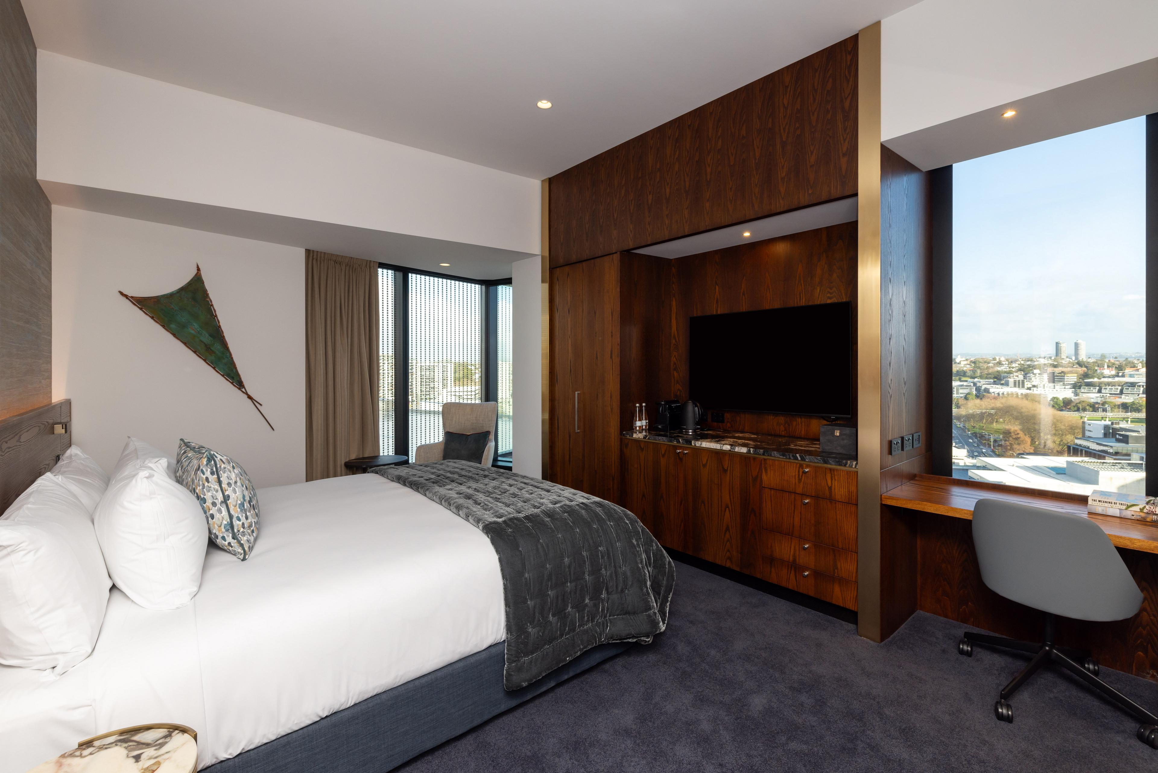 The hotel has an air bridge linkage to the Sky City main site. A pedestrian laneway adjacent to the hotel will house bars and restaurants at street level to link Hobson and Nelson Streets and interface with the convention centre.