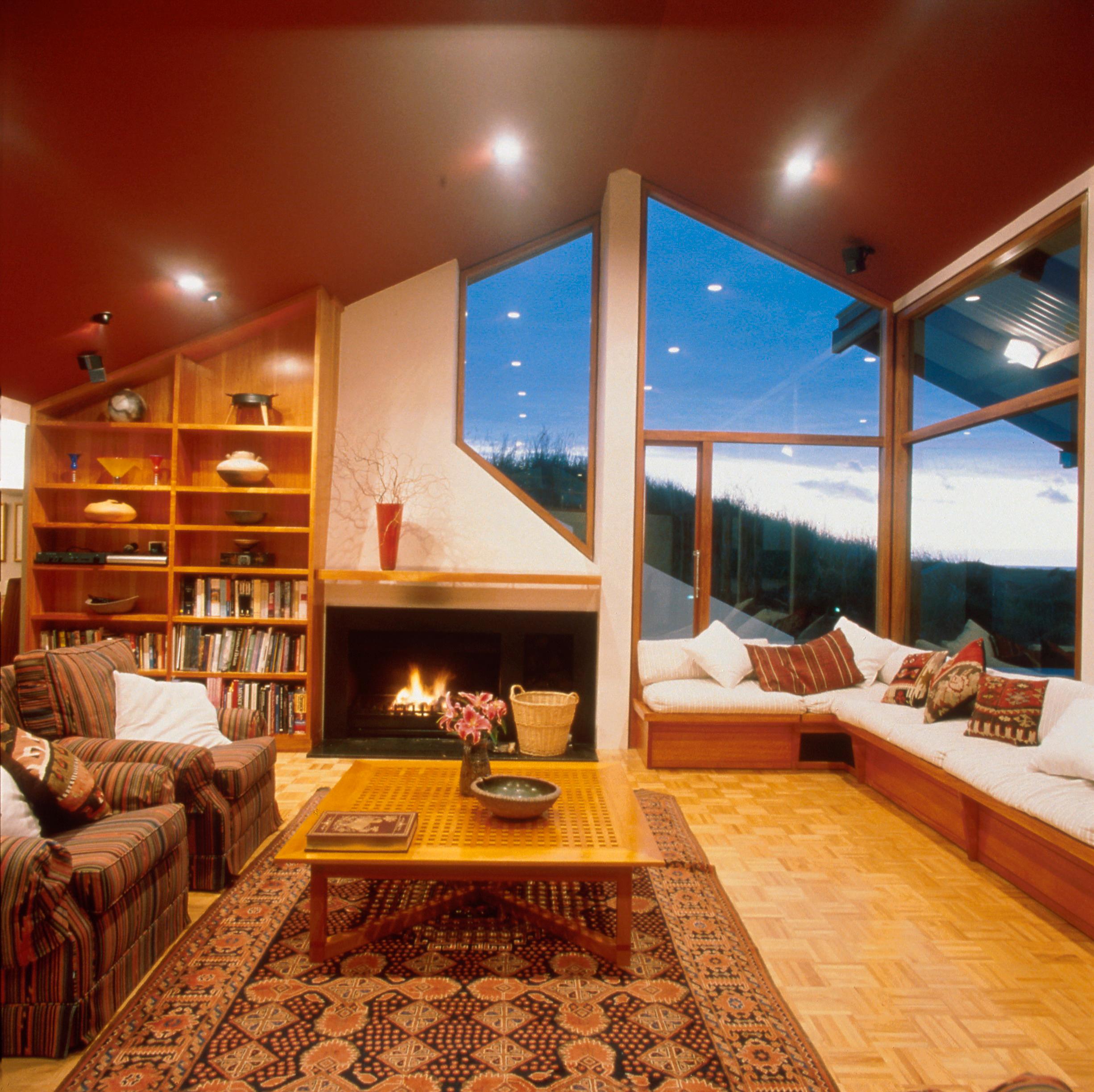 The design builds on the language of a New Zealand response to a beautiful site with 360º views and uses a restrained palette of materials consisting of weathered board and batten cladding, corrugated iron roofing, timber window joinery, tiled and carpeted floors, with quarry titled atrium, plasterboard walls and some timber ceilings.