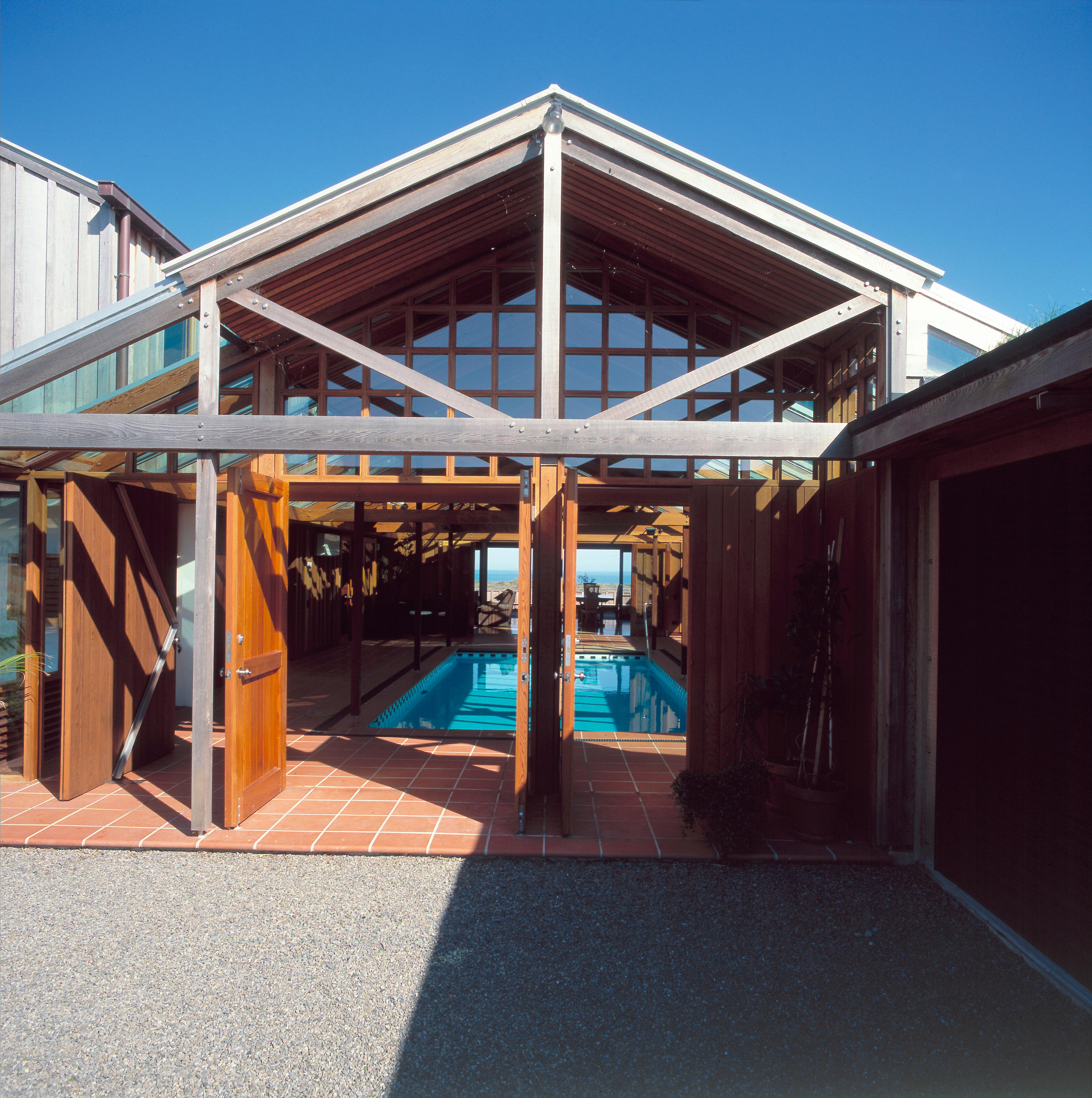 The house is arranged in a 'U' shaped plan, with a covered recreational pool and paving forming a central glazed and sheltered atrium in an environment of ever contrasting weather.