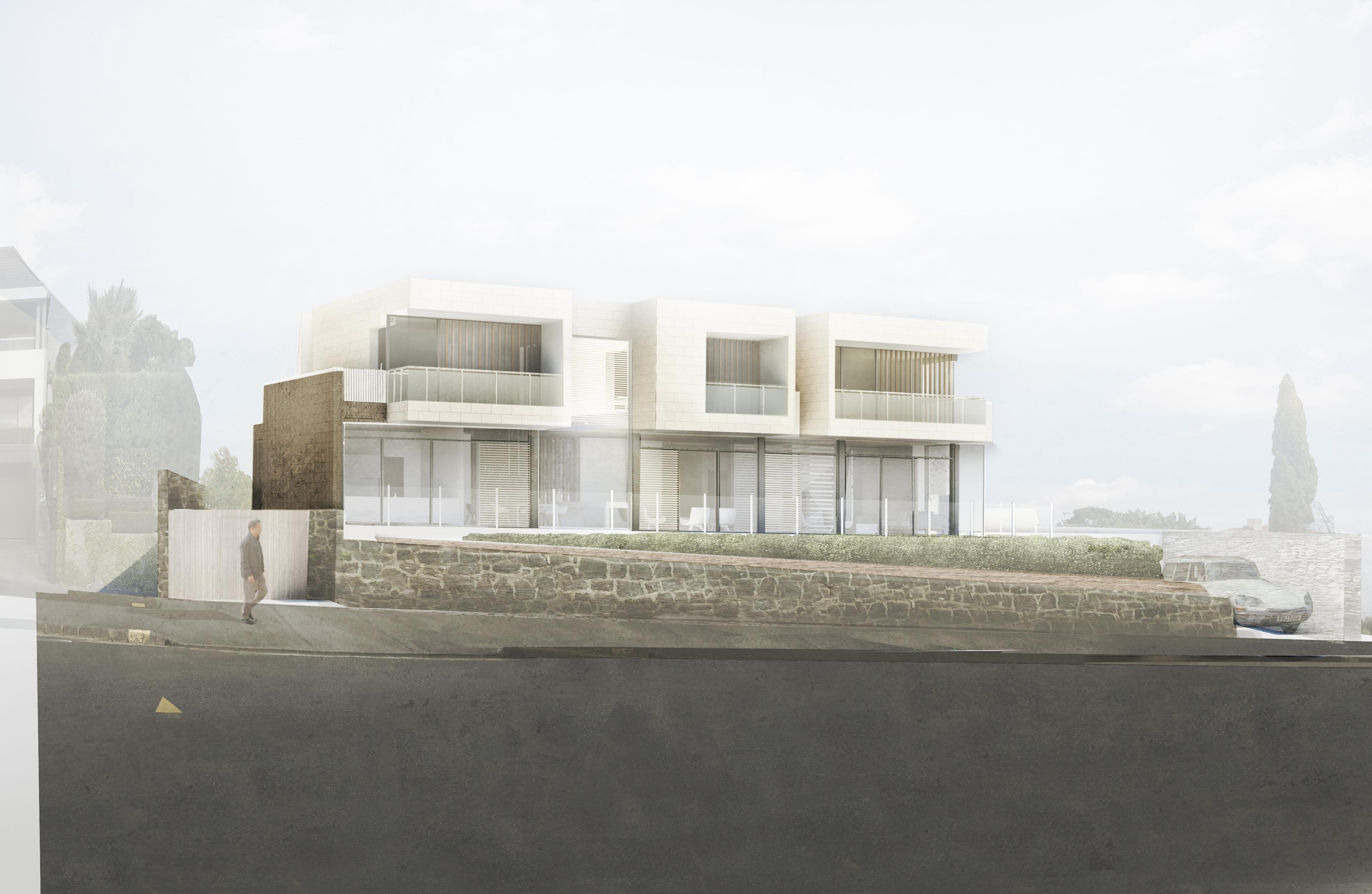 The house is concrete block construction with stone cladding, the lower portion in textured basalt stone and the upper levels in a Jura Beige smooth limestone. All external windows and doors are aluminium.
