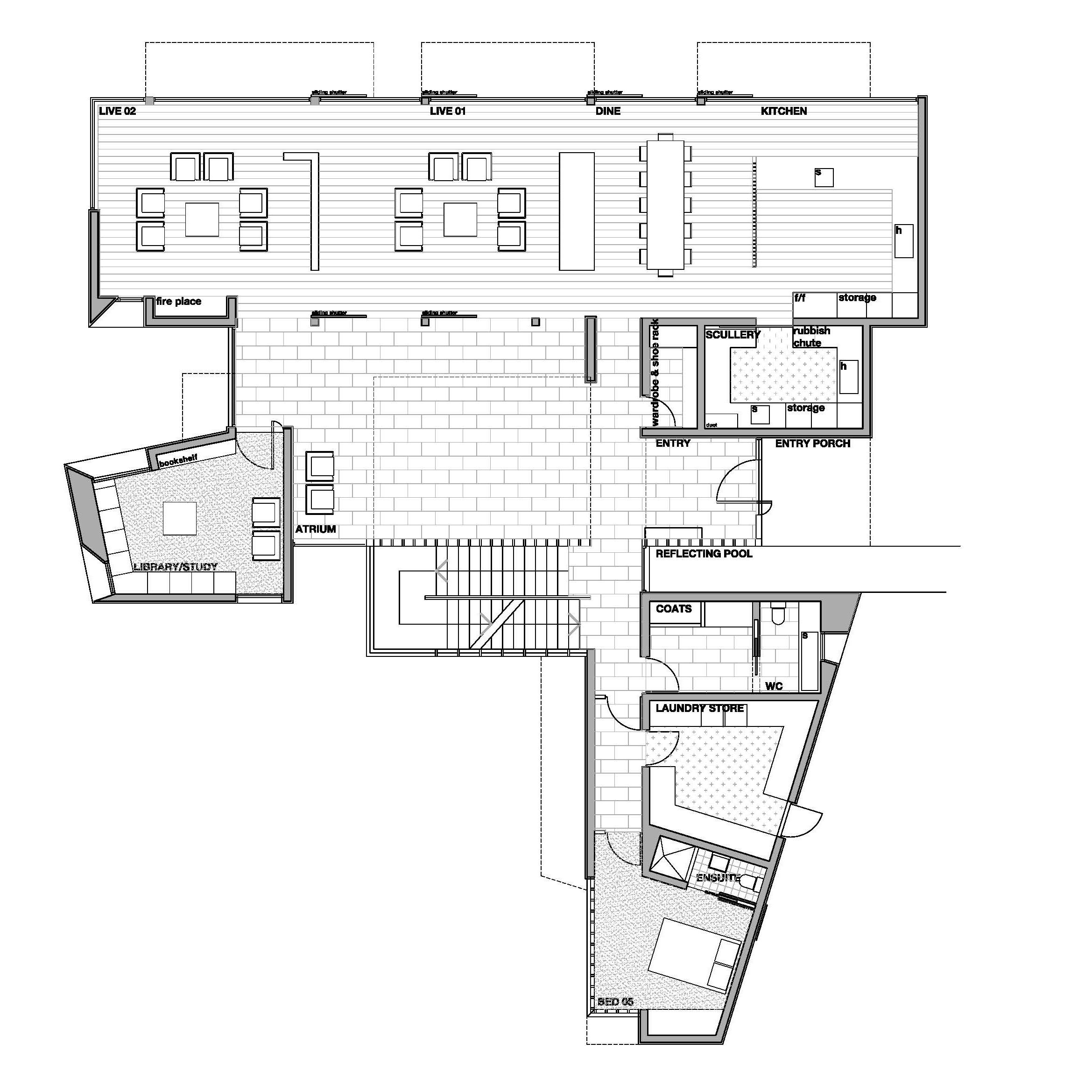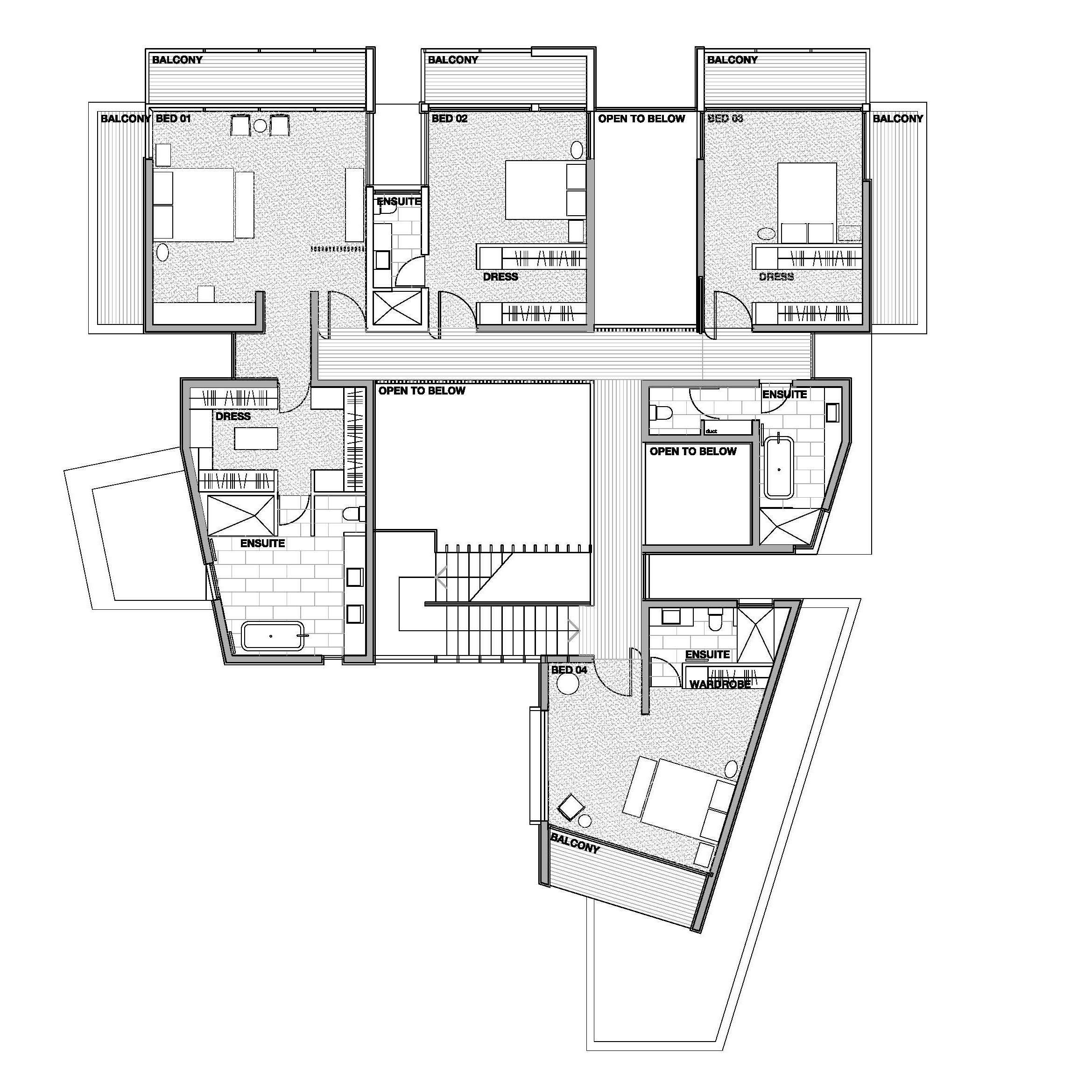 The house is designed around a central two level high atrium space that acts as an internal courtyard for the living and bedroom spaces to gather around. The living spaces primarily occupy the ground floor with the primary living, dining and kitchen areas arranged in a linear fashion to the north with a study and library space located at the western end. Ancillary services and guest WC facilities are to the south together with the fifth spare bedroom and ensuite. This service wing encloses an outdoor courtyard to the south of the main part of the house with good exposure to the western afternoon sun. The first floor comprises of four bedrooms each with ensuite and dressing rooms. These spaces are gathered around the upper level of the atrium with a stair, bridge and walkways connecting the bedrooms. Each bedroom enjoys its own private balcony.