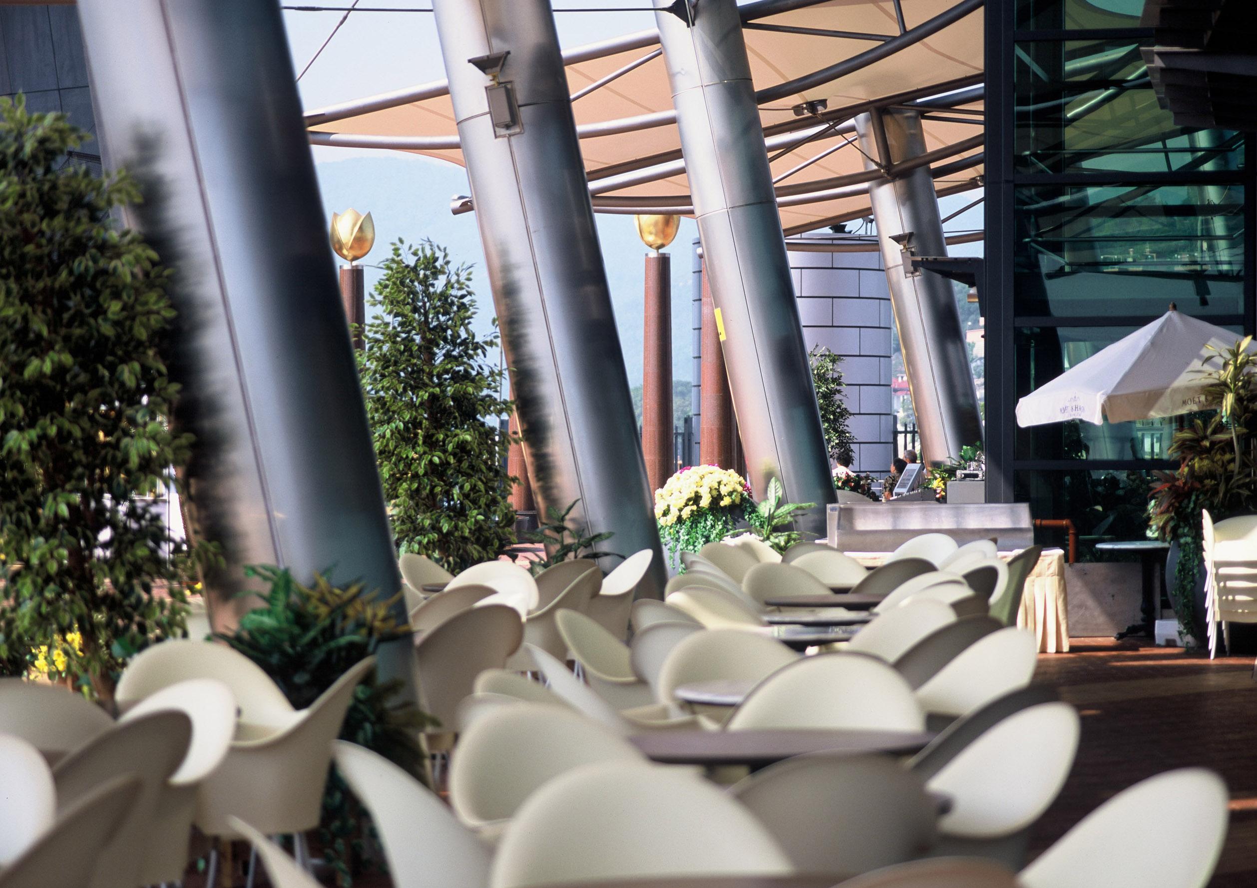 The building is curved, the ground floor promenades, cafes, and restaurants open onto open plazas and courtyards. Materials used are stainless steel, zinc, aluminium, glass, marble and granite, with extensive paved and landscaped areas.