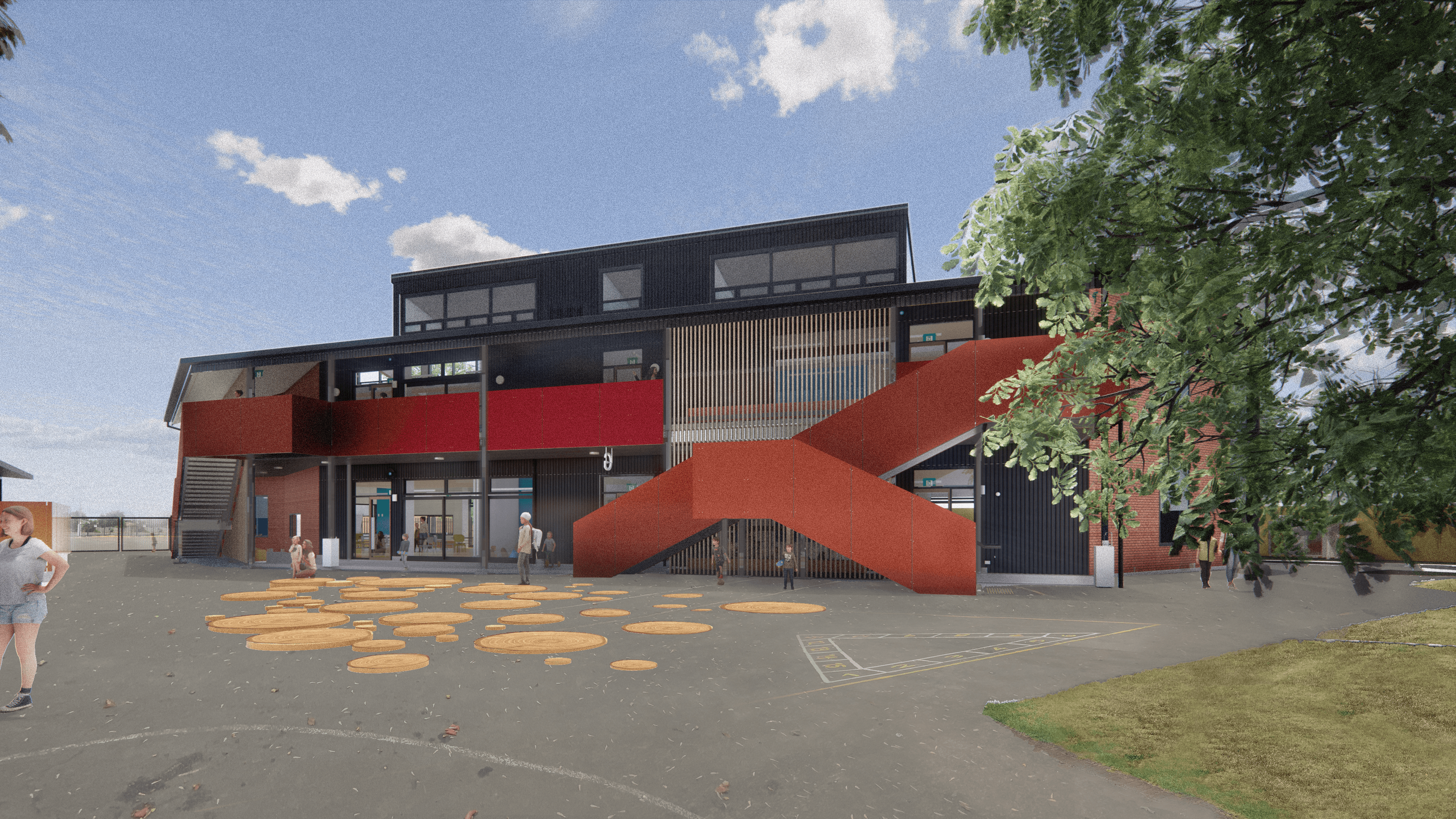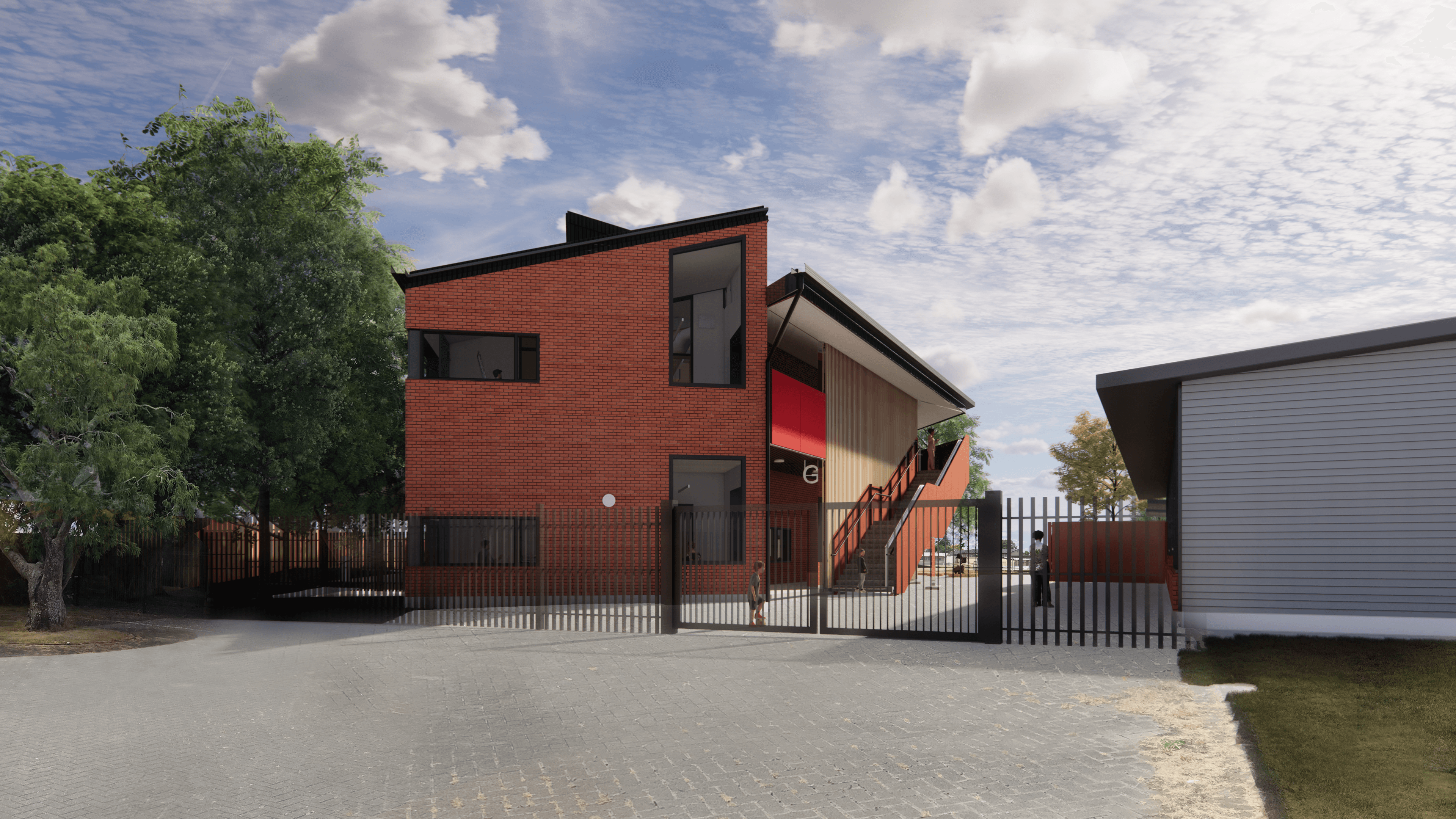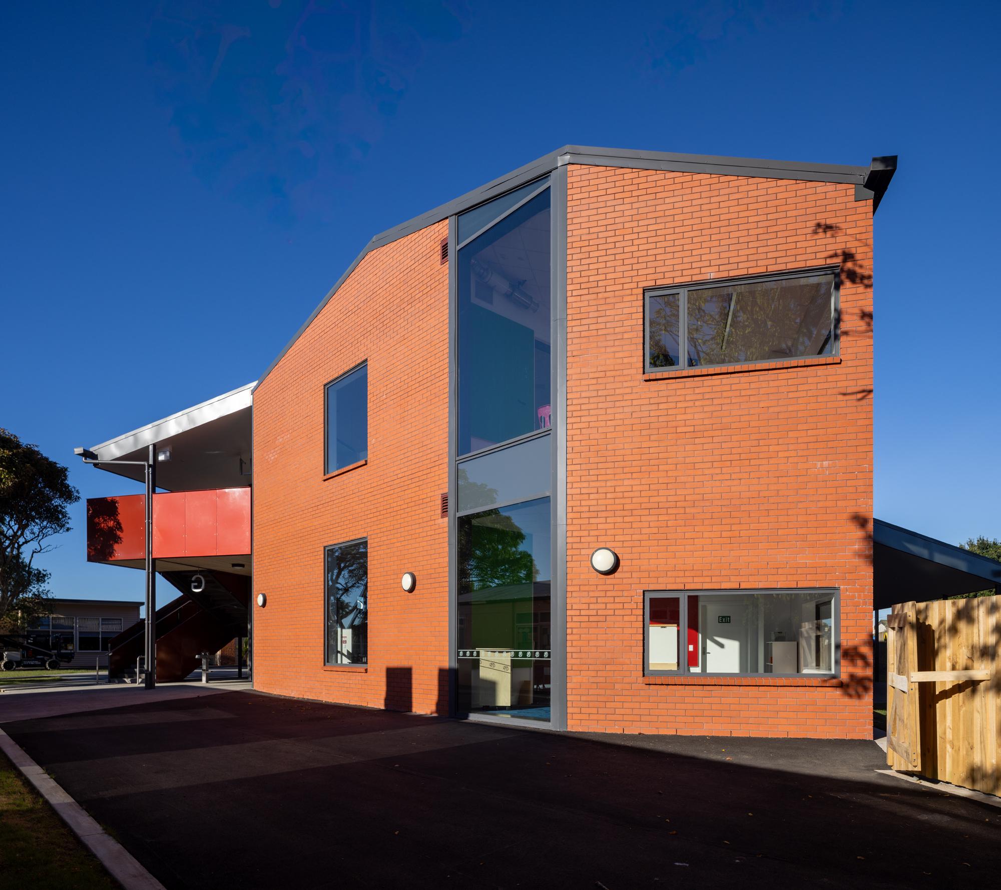 The building is clad in a mixture of brick veneer and profiled metal cladding to respond contextually to the existing school buildings and align with MoE guidelines.