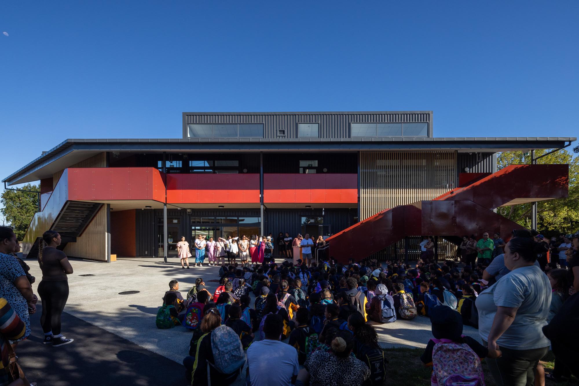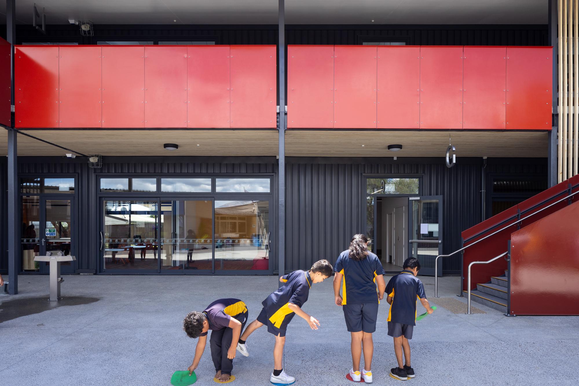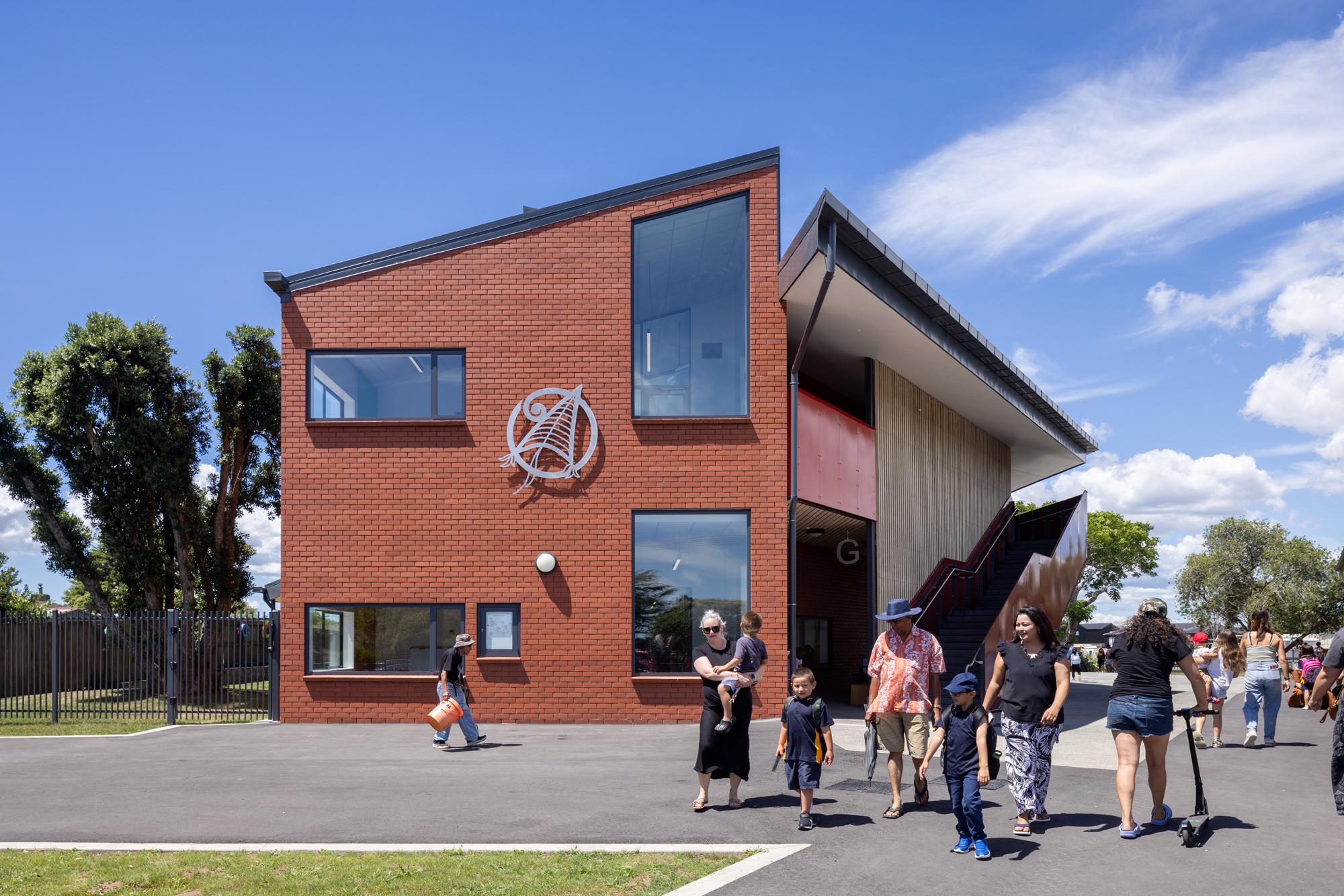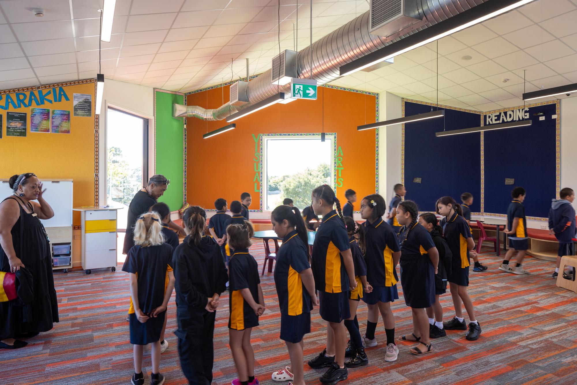 The new build location was determined by an extensive masterplan of the site. This considered future growth and needs of the school over the long term. The new build is located in an underutilised part of the site along the northern boundary to maximise open space for the school. This new building is stage one of a two-stage development, with an additional six classrooms planned for the next stage. The masterplan proposes to demolish some of the older classrooms in the next phase, replacing them with open space incorporating a school wharenui.