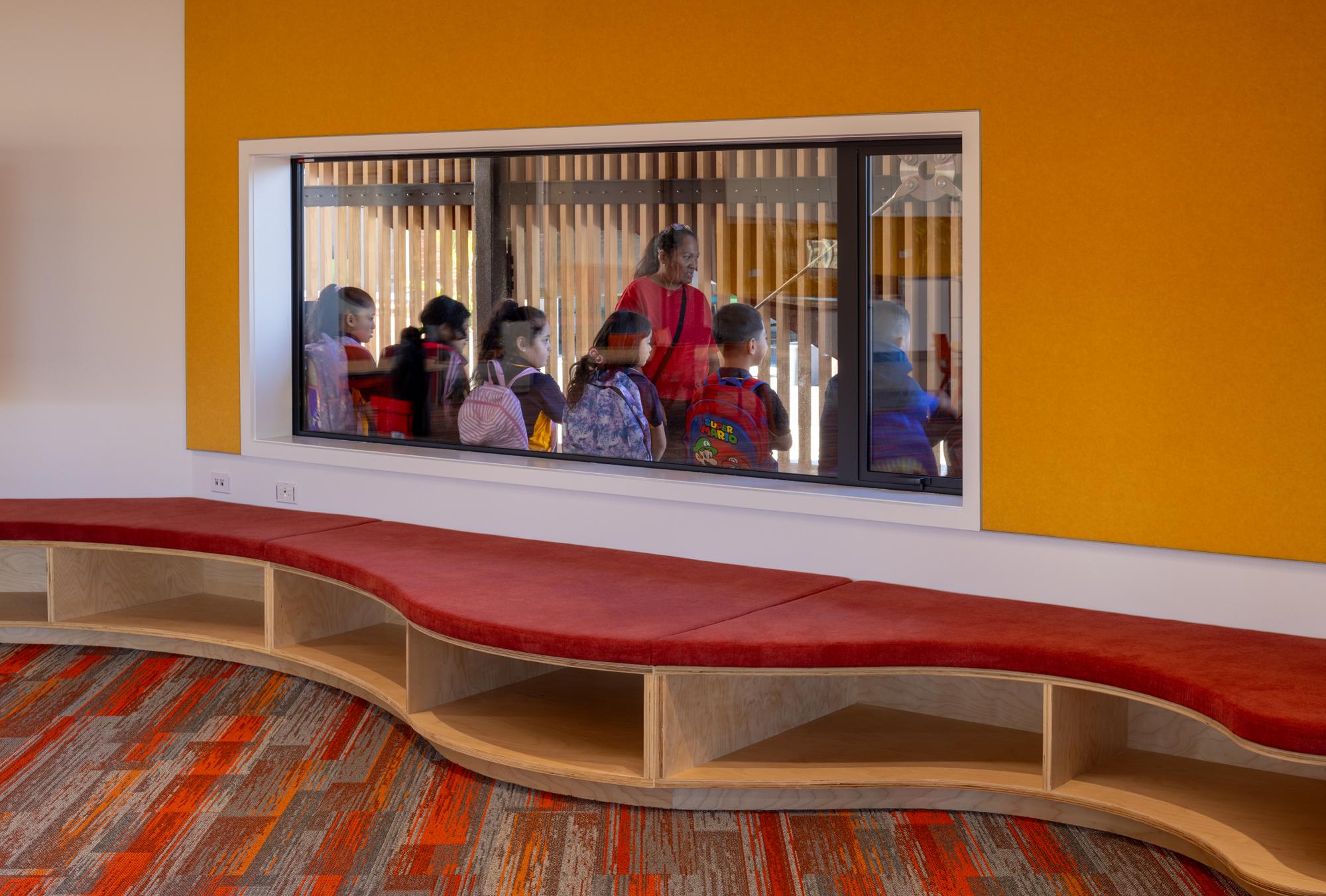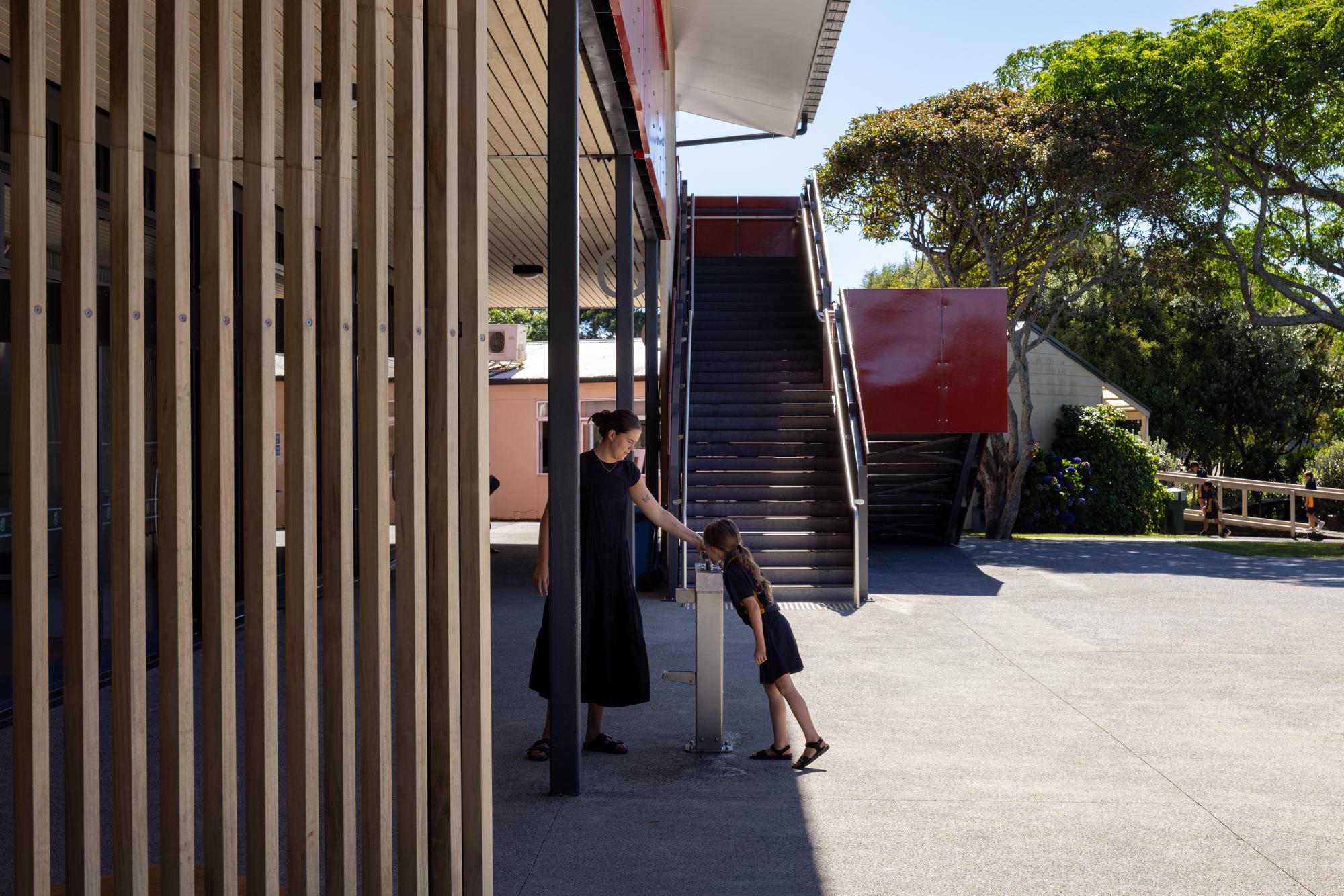 The new building addresses the existing open space and teaching blocks with a two-storey verandah featuring outdoor teaching spaces and a bag drop that provides covered space for play. On the northern side, a single-level verandah offers sheltered teaching space and art activities. Clerestory windows on the upper level allow for daylight and sunlight to penetrate the upper level teaching spaces. All the teaching spaces open up to the outside with generous sliding doors onto outdoor play spaces.