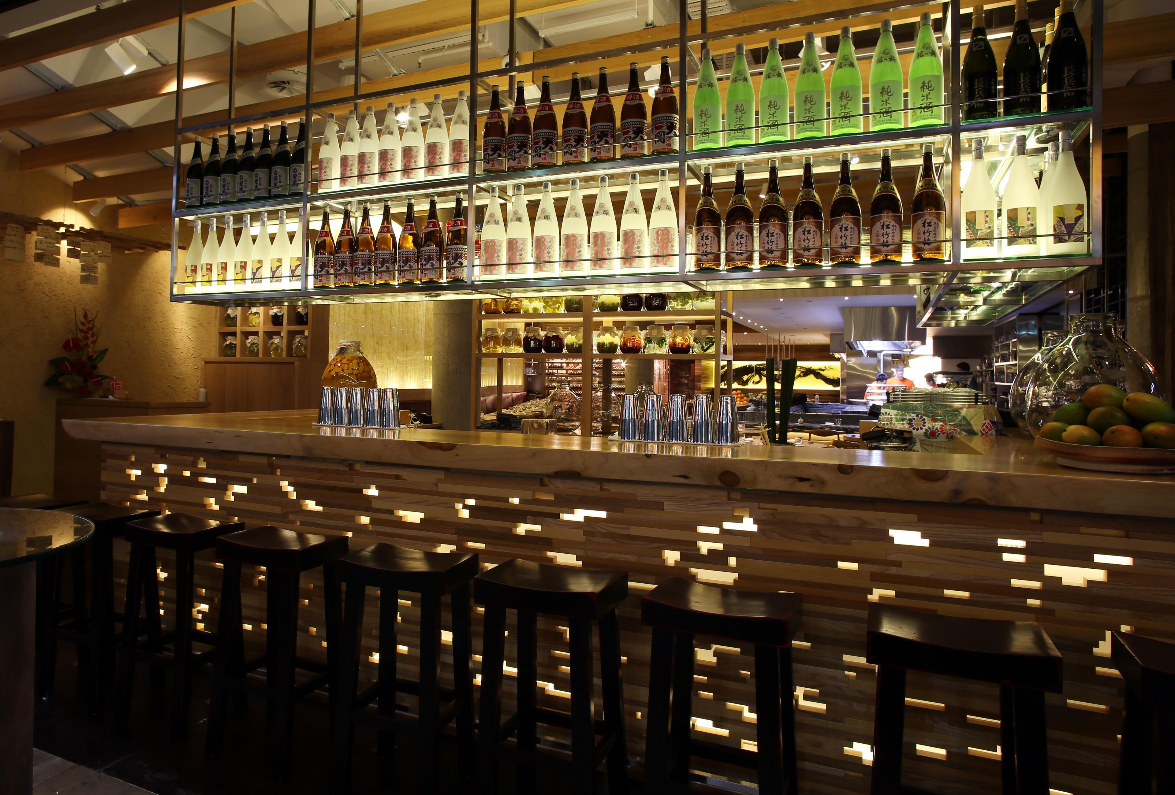The Robata grill is set at working height in the central zone, with preparation benches on four sides, one of which is placed alongside patrons sitting at a dining height, so that an interaction between chefs and diners can take place. An adjacent Chef’s Bar has an attached chef’s table which enables a direct relationship with the chefs and a sense of rejoicing and enthusing over the food and the experience.