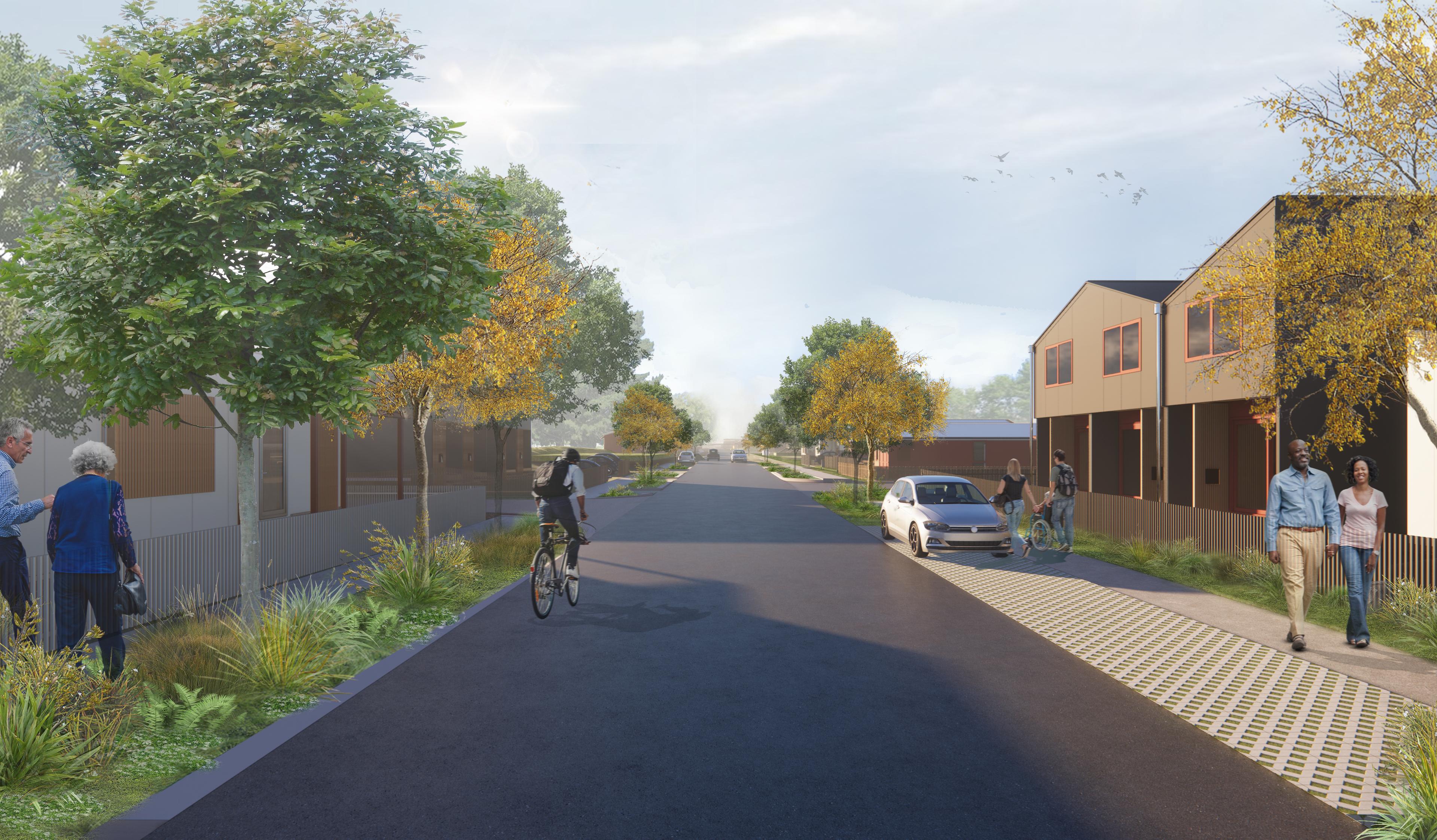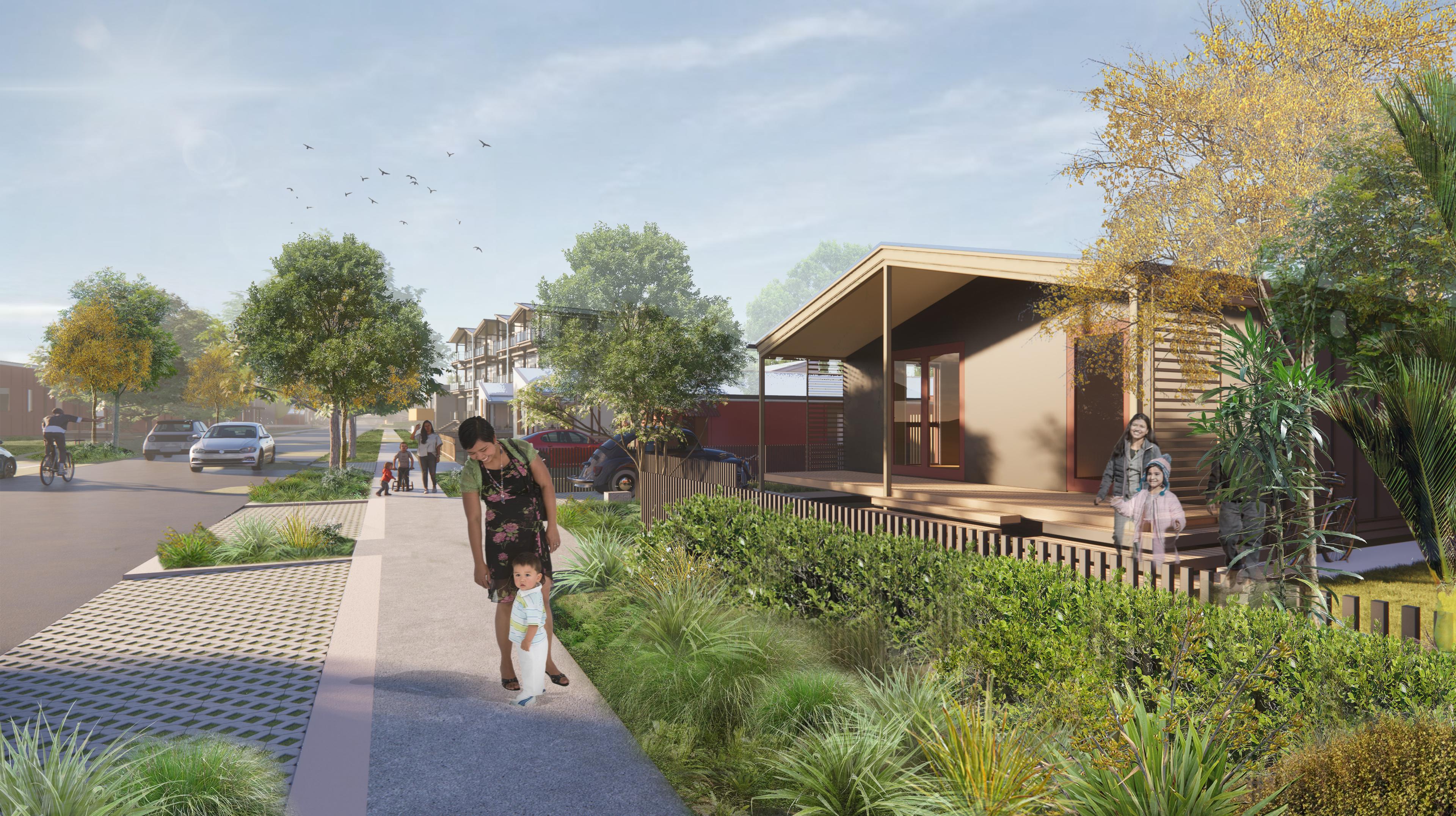 An enhanced network of pathways weaves through the site, connecting the Otaki River’s trails to new accessible routes for walking, cycling, and inclusive use. These pathways link to shared laneways, tranquil open spaces, and charming pocket parks, fostering a sense of connectivity and community spirit.