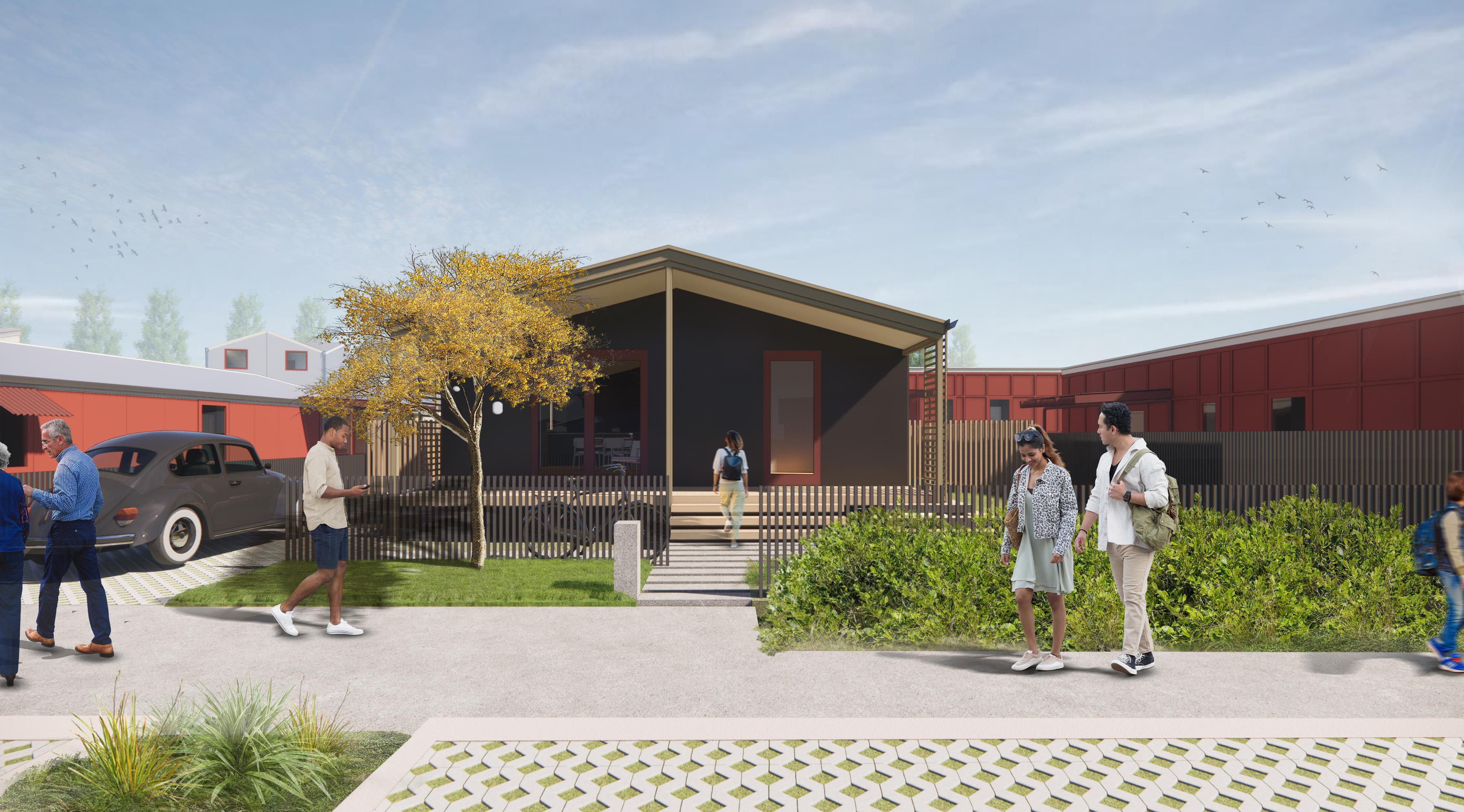 The design features diverse housing options, including single-family homes, courtyard housing, terraced homes, apartments, and cluster living spaces with shared amenities. Each home integrates pitched roofs, sheltering verandahs, and a balance of private and communal areas. Factory-built modules with cutting-edge techniques, these residences are customizable yet cost-efficient, blending modern functionality with a timeless aesthetic perfectly suited to Otaki's coastal, rural-urban character.