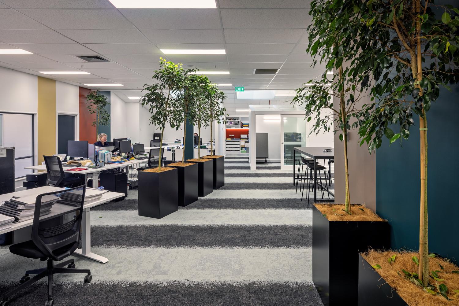 A fresh colour palette, responding to the creative environment of dance, permeates all the interiors, using an analogous and contrasting palette to create a vibrant series of colour ‘touchstones’ throughout, along with the placement of substantial trees through the work zones, to enrich the workspace.