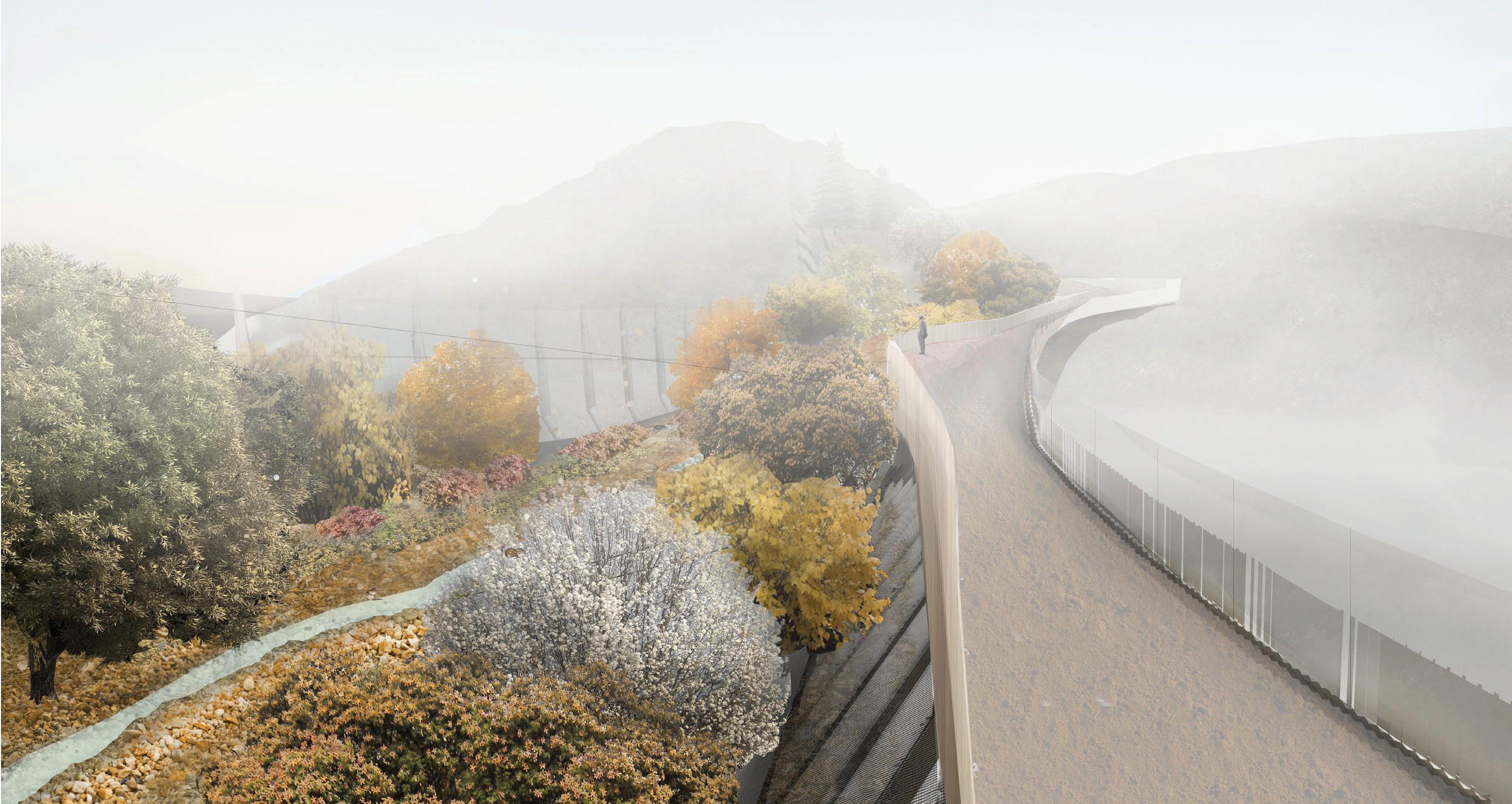 The structure of the bridge consists of steel and wood. It demonstrates aesthetics of lightness and intricacy to the surrounding environment, avoiding being heavy and monolithic. The bridge has two different elevations facing north and south - reflecting different qualities of animal and pedestrians’ paths. Being a super-light-structure, the bridge is visually and ecologically integrated to the existing mountains, co-existing with the natural landscape . It demonstrates a new mode of infrastructure that allows human and wild animals to co-exist, allows urban and natural environment to co-exist.