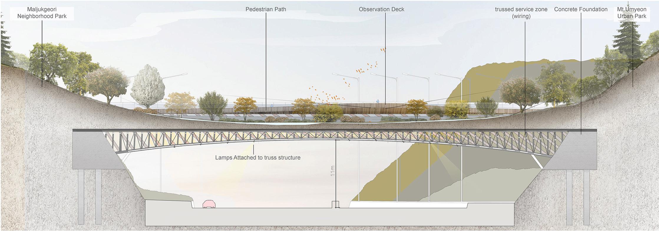 Yangjaegogae Eco-Bridge is designed as a prosthetic landscape between Mt. Umyeon Park and Maljukgeori Park at both sides of Gyeongbu Expressway in Seoul, South Korea. The bridge acts ecologically, programmatically, and formally as an extension of the existing mountains, providing a natural pathway for both animals and humans to reach the other side. The bridge consists of two paths designed respectively for animals and pedestrians . However, the two distinctive paths form a dynamic relationship that enables pedestrians and wild animals to co-exist.